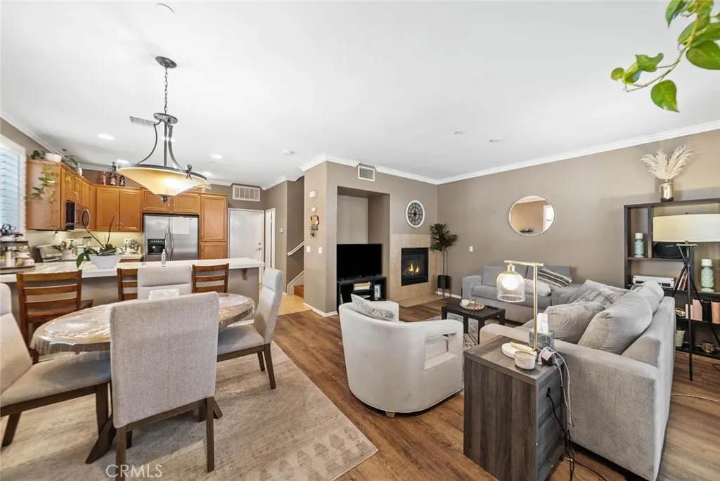 Inviting living room with cozy fireplace and direct access to the dining area