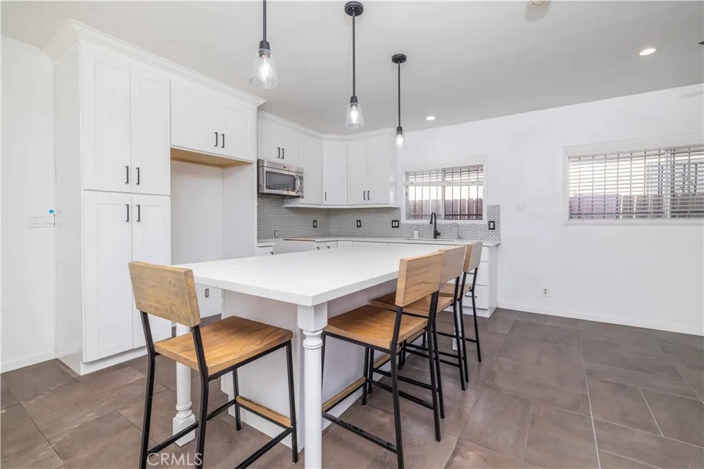 Welcome to 2432 E 112th Pl, a traditional Los Angeles bungalow that has been completely reimagined for modern comfort without losing its soul. A new roof sits overhead and new paint inside and out makes the whole home feel fresh, crisp, and move-in ready. Natural light filters through newly screened windows, bouncing off the quartz countertops and bright white shaker cabinets in the kitchen. The large island, accented with pendant lighting overhead, centers the space and invites you to gather. It’s a kitchen designed for real life finished with an under-mount stainless steel sink, subway tile backsplash, and updated black hardware that brings contrast and clarity.