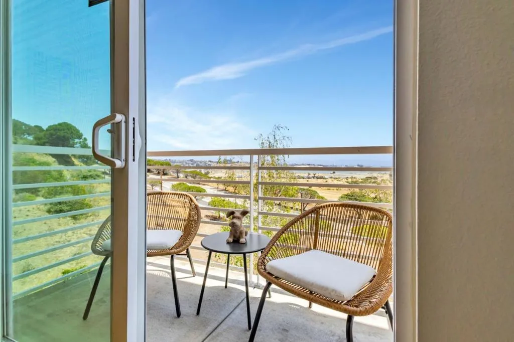 Welcome to 501 Crescent Way, a rare top-floor condo offering bright, open living and scenic views of the San Francisco Bay. This 2 bedroom, 2 bath home combines comfort, functionality, and a peaceful setting. The living and dining area is filled with natural light from large windows and opens to a private balcony, ideal for taking in the morning sunrise. The kitchen features stainless steel appliances, a gas range, and generous cabinet space, making it both stylish and practical. The primary bedroom includes a walk in closet and an ensuite bathroom with dual vanities. A second bedroom, full bath, and in unit laundry add flexibility and convenience. Additional amenities include one secure parking, a fitness center, and walking trails. With easy access to MUNI bus routes and major freeways like 101, commuting and exploring the Bay Area is simple and efficient.