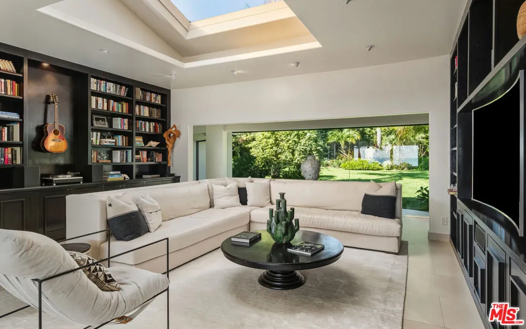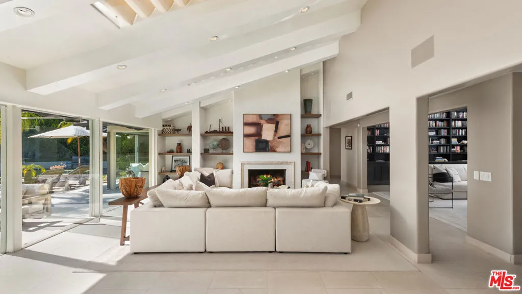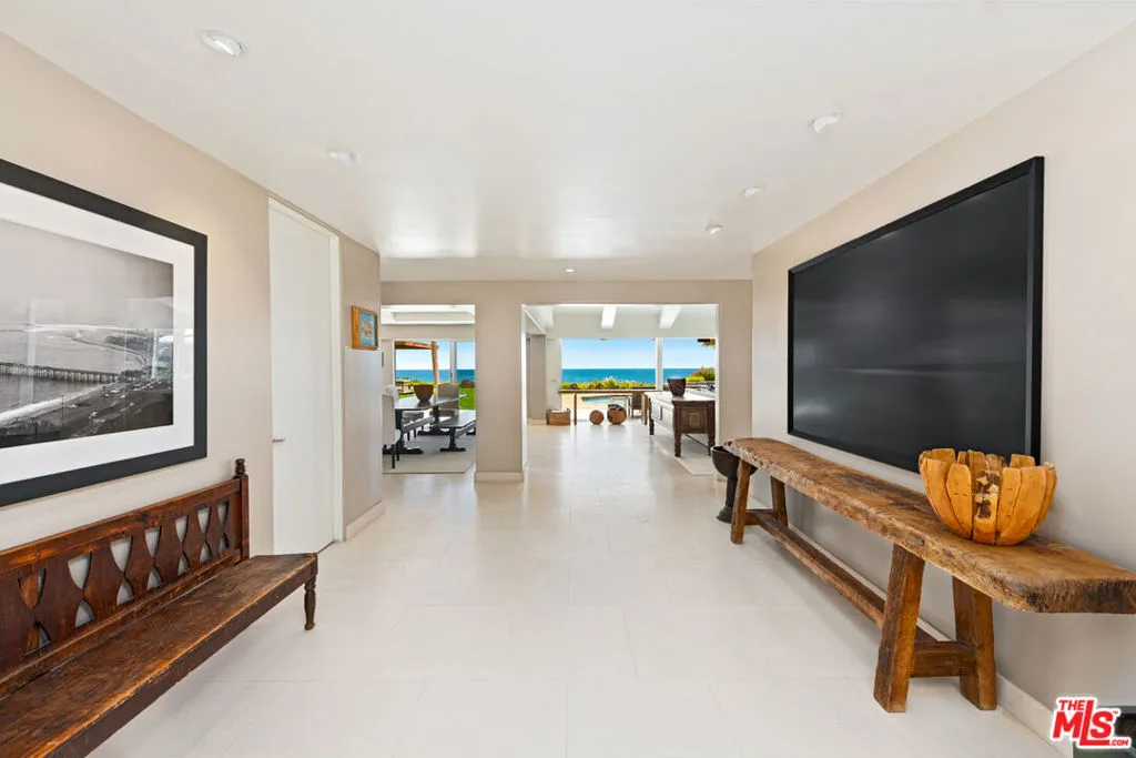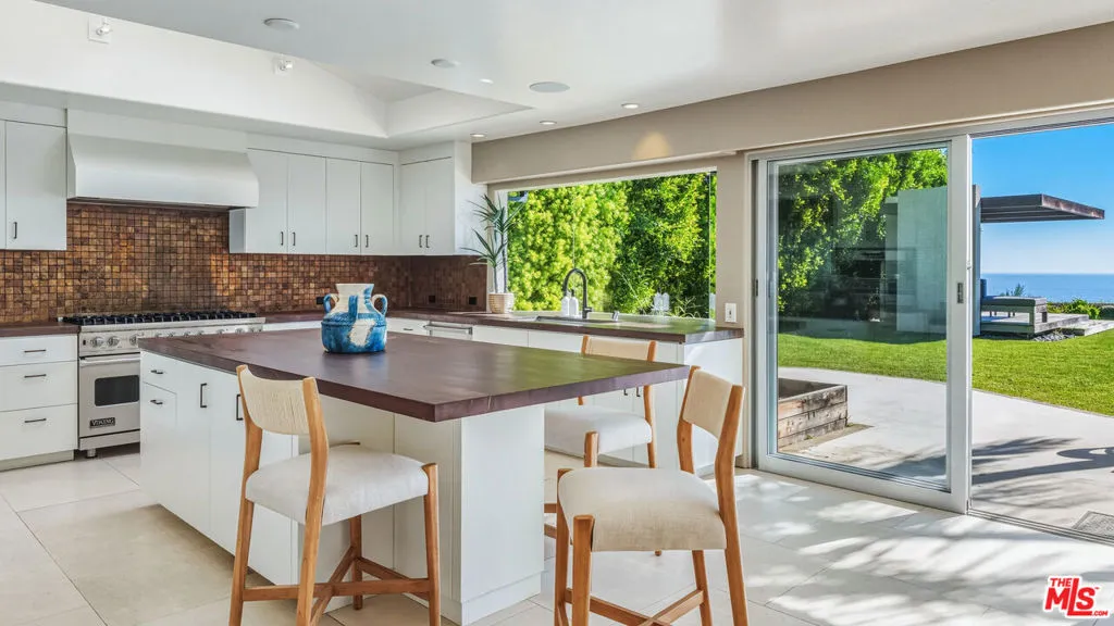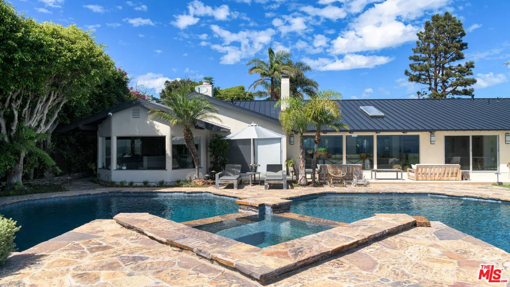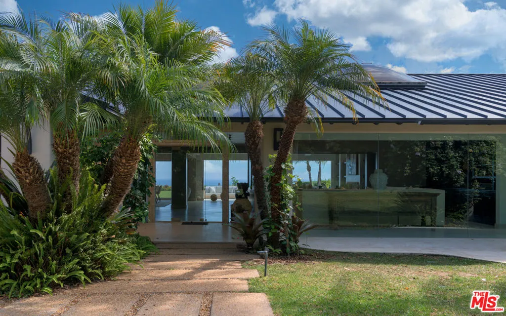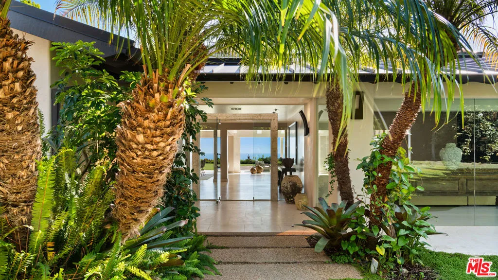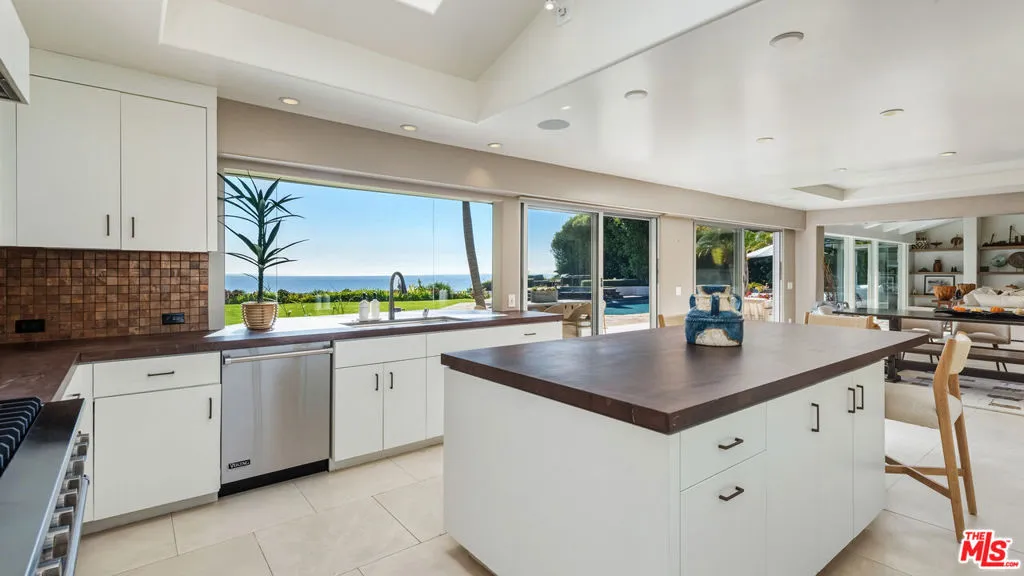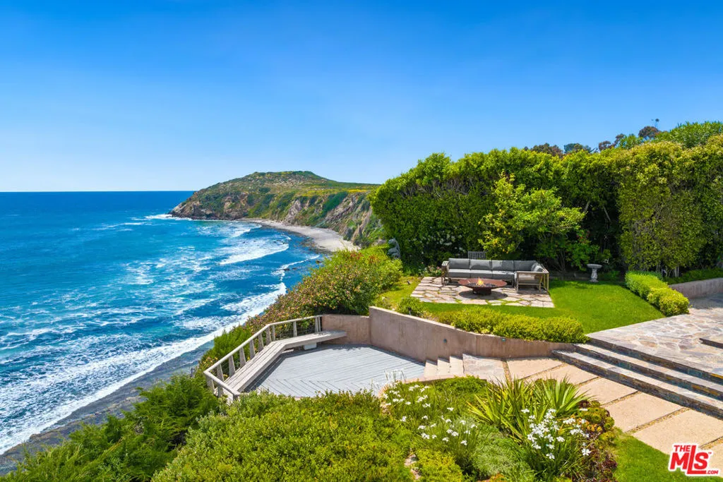 Exceptionally private and awash with natural light, this gated Point Dume blufftop estate provides over an acre of indoor-outdoor living with absolutely spectacular ocean, island, and Queen’s Necklace views. Surrounded by expansive lawns and manicured landscaping, the single-level home has a large swimming pool and a huge entertaining deck overlooking the shoreline and the sea. Gracious, open interiors with high ceilings, many skylights, generous built-ins, picture windows, and wraparound walls of glass offer wonderful sight lines to the pool, gardens, and views. Furnished for elegant comfort, the main living area flows seamlessly between the large living room with a fireplace, the dining area with a tray ceiling and service bar, the spacious media room/library with a wall of book shelves, and the marvelous chef’s kitchen. Equipped with top-quality appliances and an island with bar seating, the kitchen enjoys backyard, pool, and ocean views, and opens to the patio for poolside al-fresco dining. The home’s four bedrooms include a private guest suite with kitchenette and bath. The primary suite is a tranquil, ocean-view retreat with a walk-in closet and an amazing spa-like bath complete with skylights, gorgeous stonework, a spectacular garden-view sauna, and enormous windows facing the pool and ocean views. In addition to the huge front lawn, with a garden bench and swing-set, the home’s resort-like backyard is the perfect setting for large and small gatherings, dining, recreation, and undisturbed relaxation. With its amazing views, the backyard centers around the large waterfall pool and spa with a flagstone pool deck. There is a partially covered patio lounging area, a pergola with built-in couches, a step-up seating area with a fire pit, a barbecue, an outdoor shower, and a stunning blufftop entertaining deck with benches and views, views, views. Additional features include a mud room, a two-car garage with a washer and dryer plus an extra refrigerator and freezer, guest parking for six cars, and lifestyle amenities such as a full-house sound system and camera security, plus a coveted beach key.