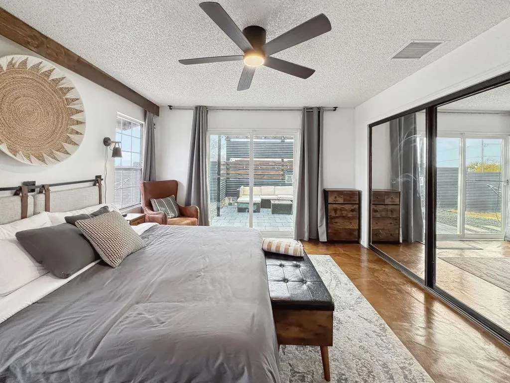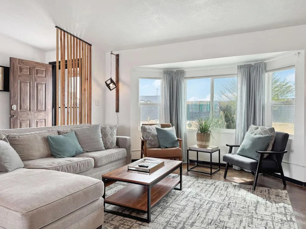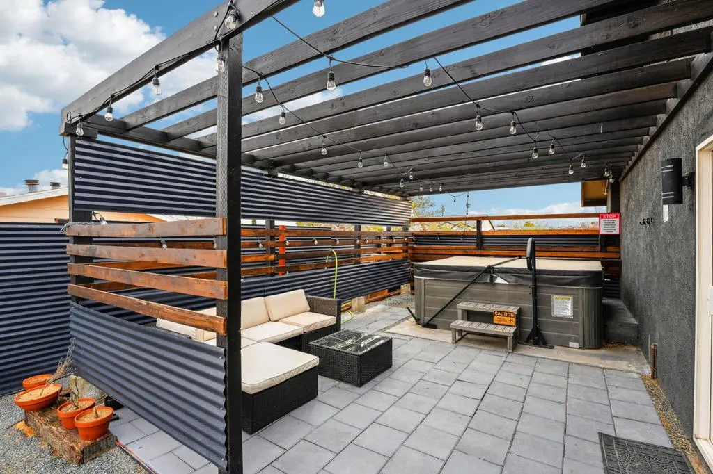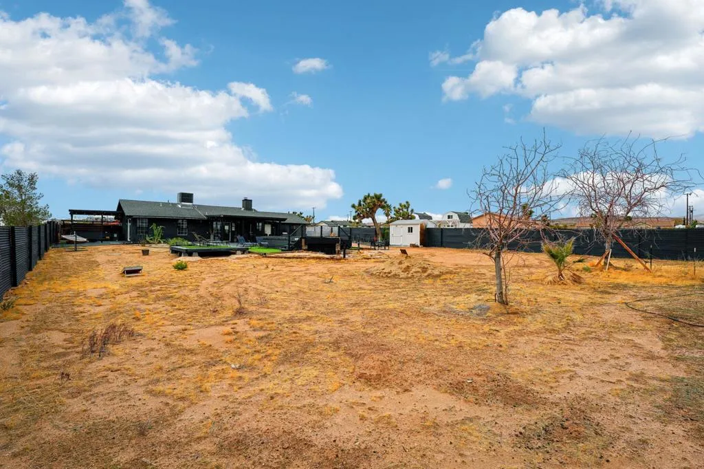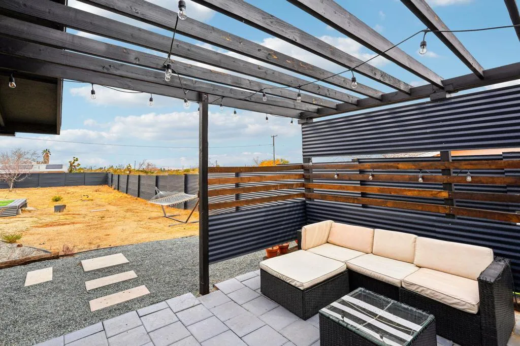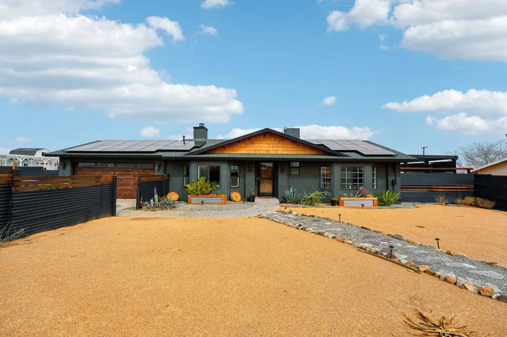 Gorgeous 2 bed, 2 bath featuring great curb appeal, leased Solar Panels, and many updates throughout! Enter into the living room with wood panel feature wall and electric fireplace with raised hearth. The living room opens to the dining area with custom wooden wall design and the remodeled kitchen featuring granite countertops with included refrigerator, light grey cabinetry, and a breakfast bar seating area. The laundry room sits just off of the kitchen with included washer and dryer, and the room also accesses the garage. Both of the bedrooms are generously sized with the primary bedroom offering a private bathroom with dual sink vanity and walk-in shower and there is a slider to the side yard with covered pergola, hot tub and pavers. There is also a 2nd bathroom for guests and the secondary bedroom to share, also featuring a walk-in shower. Enjoy the private backyard with container pool, firepit, covered patio, and beautiful joshua trees! There are also 2 accessory buildings and plenty of flat useable space that is ready to be made your own! Sitting off of a paved road, and currently an Active Vacation Rental, do not miss your opportunity to own this fantastic home!