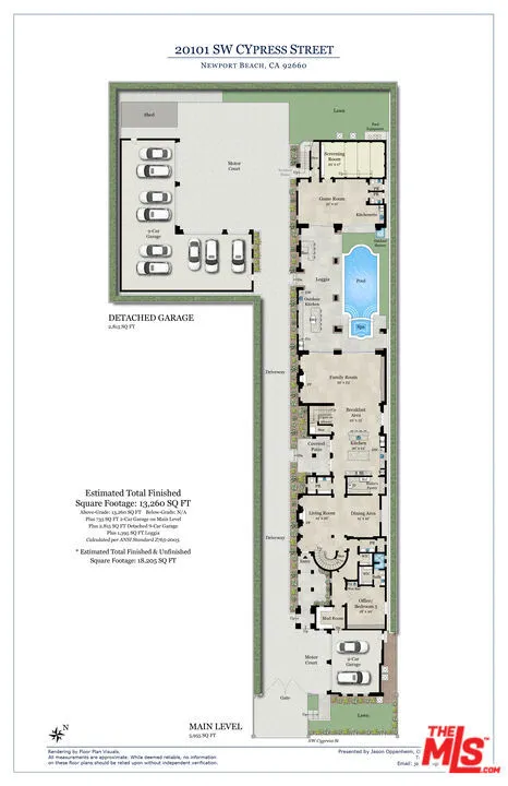 This private estate boasts impeccable craftsmanship and design on more than half an acre of flat land. Set behind private gates, this compound-like residence offers more than 18,200 sq. ft. of living space (including a 3,500 sq. ft., 11-car garage), five en-suite bedrooms, 10 baths, a soundproof home theater with memory foam carpet, a game room, office, wine cellar, an attached guest house with private entry, a spacious home gym, and much more. No expense was spared in this refined custom home, featuring premium finishes throughout, including limestone flooring, 12-ft. wood-beam ceilings, and palatial corridors. The gourmet kitchen is replete with state-of-the-art appliances, leathered granite countertops, a butler’s pantry, and two kitchen islands with scratch- and stain-resistant Kedra countertops. The resort-style backyard showcases a pool/spa, outdoor shower, and a massive loggia with lounge areas, a bar, and a 1,500 sq. ft. covered outdoor kitchen featuring a built-in BBQ with a rotisserie, warming drawer, oversized glass refrigerator, nugget ice machine, and more. The 1,300 sq. ft. primary suite occupies its own wing, featuring an office or nursery space, a boutique-style walk-in closet, a spa bathroom, and a fireplace. Conveniently located on the upper level is a full-sized laundry room with dual washer and dryer units and a dog washing station; a third laundry set is situated in the lower-level butler’s pantry. The entire main house is wired to a generator for power outages and is equipped with a Falsken water filtration system. It features built-in audio and an extensive video surveillance and monitoring system. This exclusive address offers a rare opportunity for those seeking privacy, opulence, and space, just minutes from the best destinations in Newport Beach.