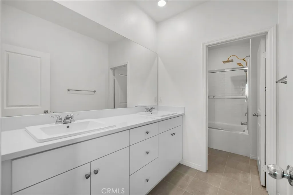 Upstairs, the home features dual primary suites, each with its own en-suite bath and separated for maximum comfort and privacy. One bedroom includes a generous walk-in closet, while the other offers a private balcony with views overlooking the community pool. An upstairs laundry room adds to the home’s practical and efficient layout.