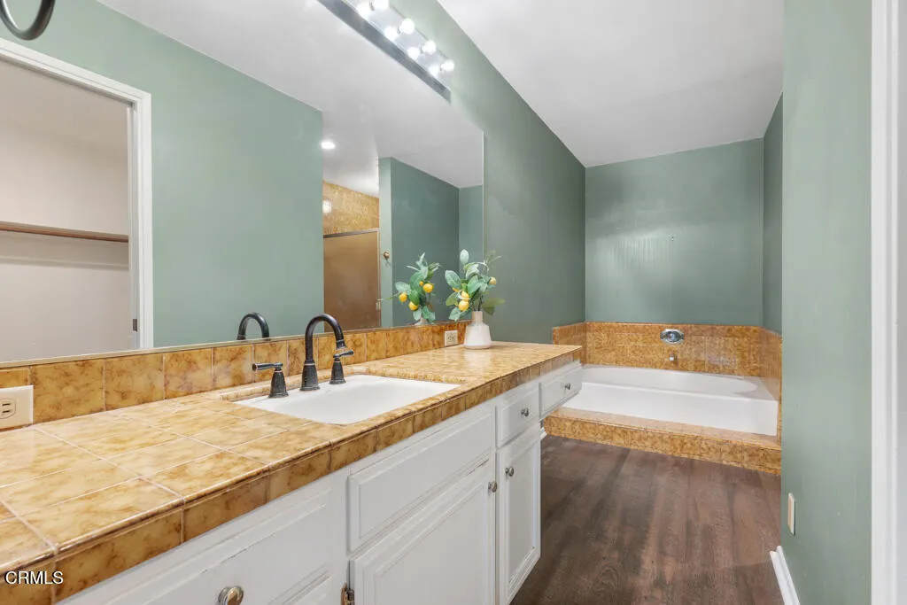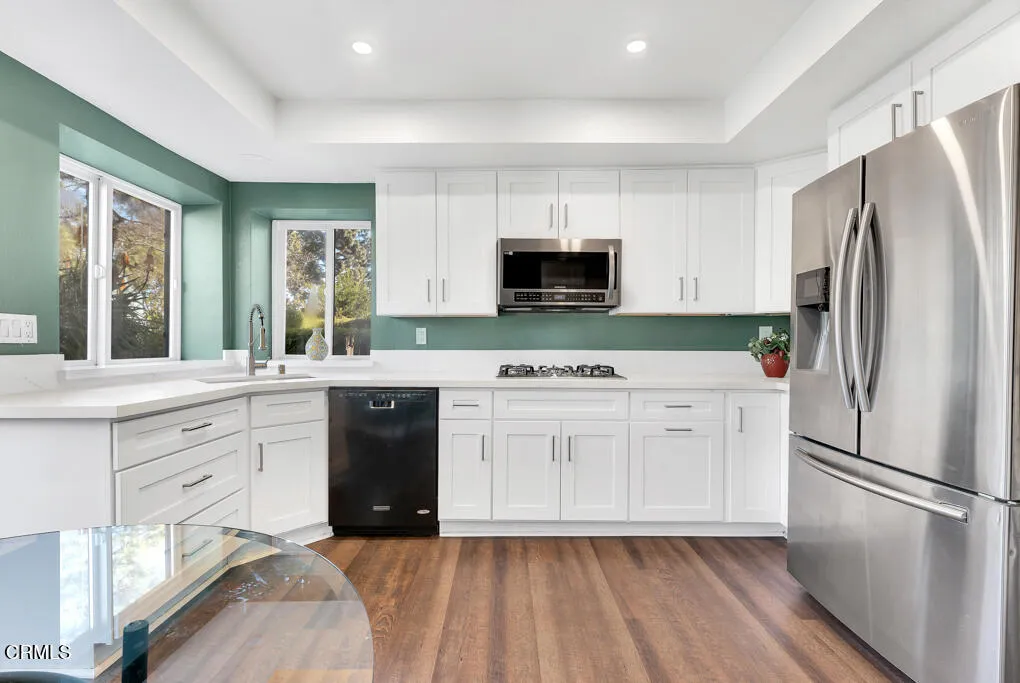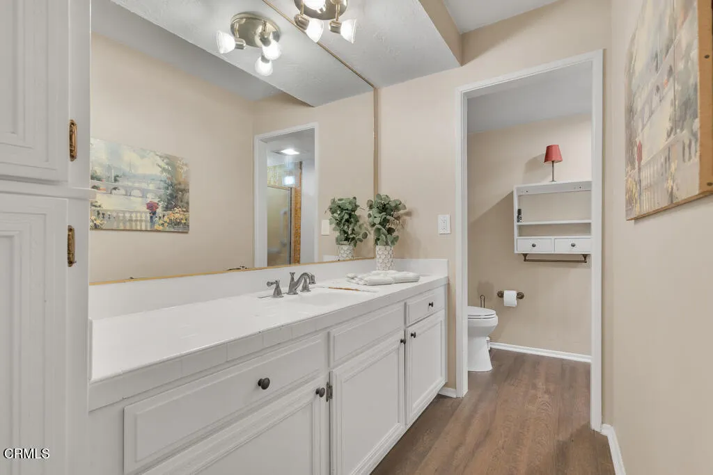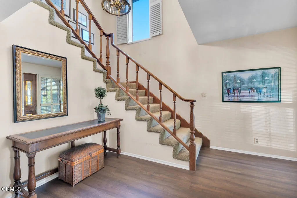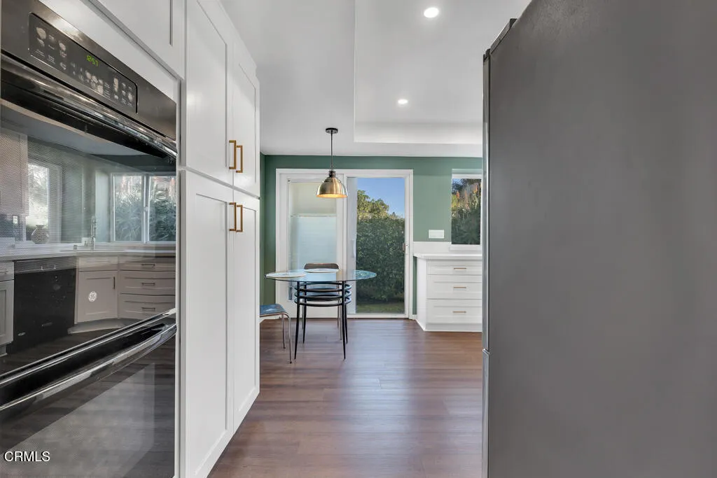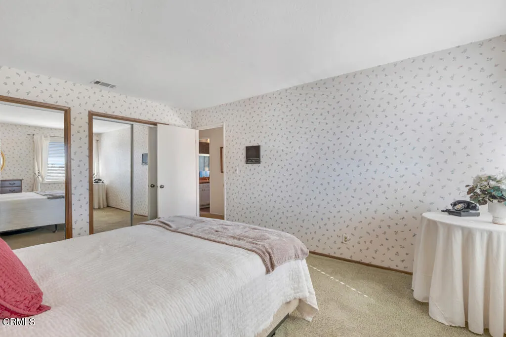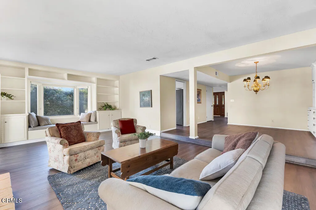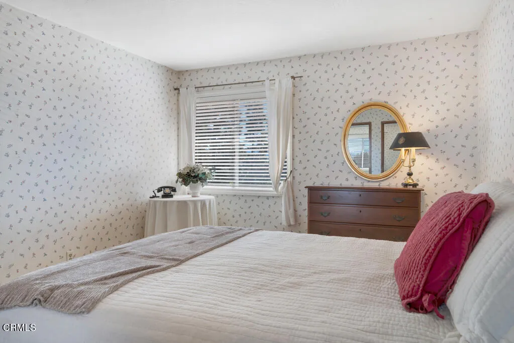 Introducing Villa Esplendido, a charming enclave ideally located adjacent to Nancy Bush Park. This spacious two-story attached residence enjoys picturesque views of the park and sparkling Camarillo city lights, offering a blend of comfort, character, and lifestyle convenience. The main level features a welcoming living room, dining room, kitchen, laundry room, plus a generously sized bedroom and 3/4 bathroom–perfect for guests or flexible living. The recently remodeled eat-in kitchen shines with modern upgrades including quartz countertops, double ovens, and a gas cooktop, along with a sliding door that fills the space with fresh air and natural light. The living room is warm and inviting, highlighted by a gas fireplace, bay window with seating area, built-in bookshelves, and sliding doors that open to a large rear patio–ideal for indoor-outdoor entertaining. The dining room offers a built-in hutch with abundant storage for hosting essentials. Cleverly tucked beneath the staircase is a hidden storage area with built-in shelving, perfect for pantry items, crafts, or hobbies. A truly unique feature of this home is the subterranean wine cellar, complete with a tall center counter–an intimate space to share a glass of wine with friends or family. This room can also serve as additional storage if desired. Upstairs, you’ll find three spacious bedrooms filled with natural light. The primary suite is a private retreat, featuring a large walk-in closet, sitting area, gas fireplace, and a well-appointed bathroom with separate tub and shower. Step outside onto the private deck to enjoy serene views of the park and surrounding neighborhood. One additional bedroom also offers its own deck with pleasant views, while the remaining bedroom shares a hall bath. The property shares one wall with an adjacent home and is ideally situated in Camarillo–just minutes to the beach, downtown Ventura, and approximately one hour to Santa Barbara or Los Angeles. Villa Esplendido offers space, character, and a location that captures the best of coastal Southern California living.