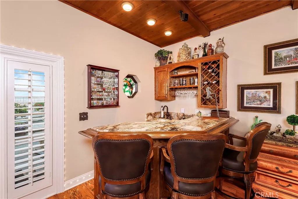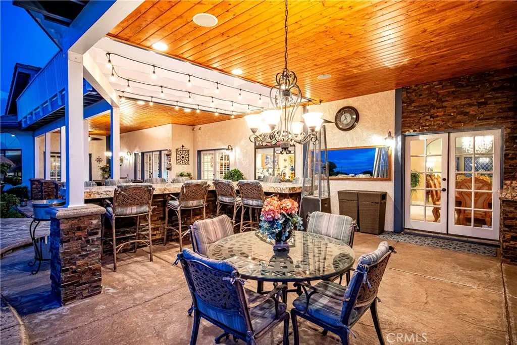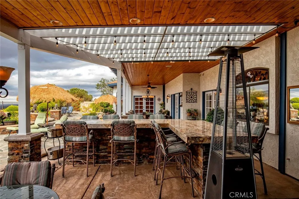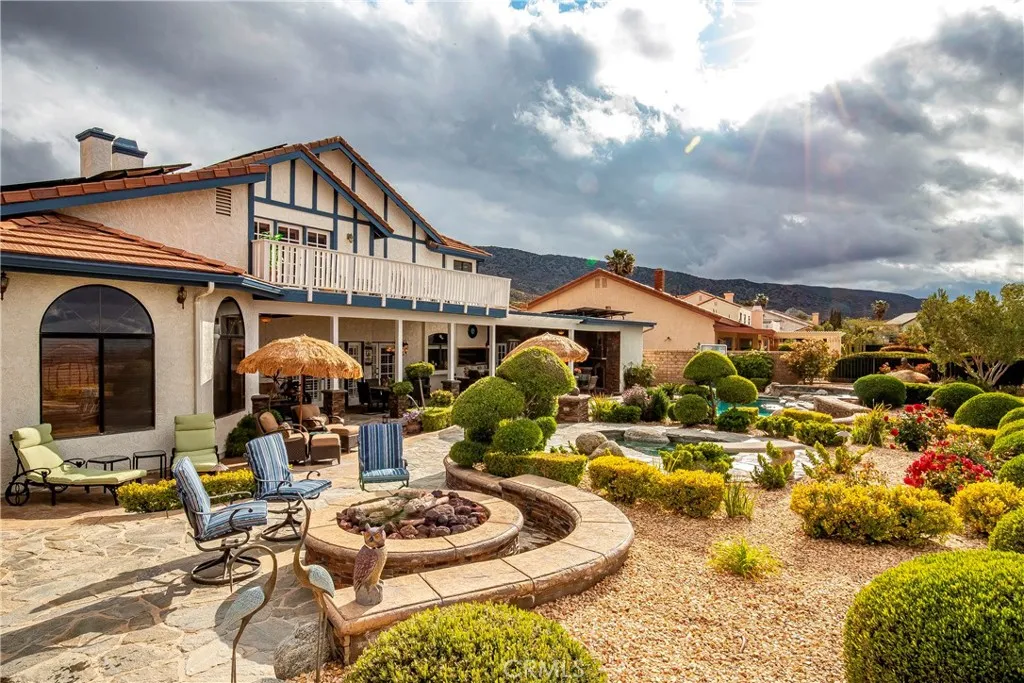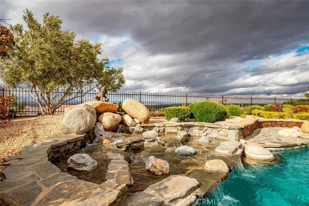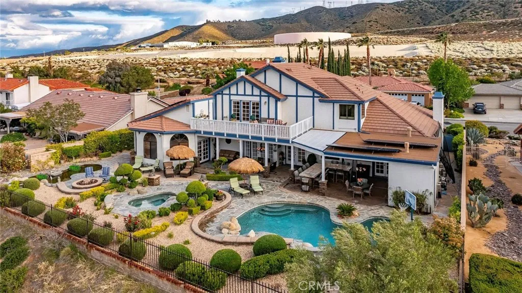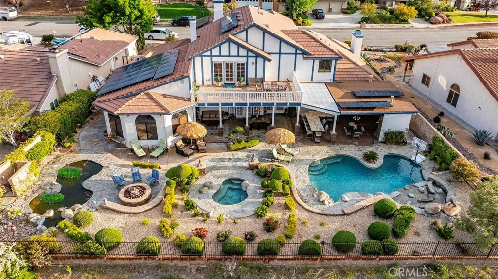 Stunning custom-built home with an ADU, POOL, PAID SOLAR, and more!!! This 5 bd. + 4 ba. 4,193 sq. ft. home sits on a sprawling 12,513 sq. ft. lot with PANORAMIC VIEWS of the valley. NO HOA or MELLO-ROOS! Gorgeous curb appeal of lush lawns, manicured landscape, brick hardscape, concrete walkways, and wrought iron double entry doors. Guests are greeted at the formal entry with the elegance of marble flooring and a stylish chandelier. The formal living room has a bay window and gas-burning fireplace, and the formal dining room has crown molding, a French door, and a mirrored ceiling. The gourmet kitchen offers an expansive island with a Thermador cooktop and top-of-the-line appliances, including a KitchenAid double oven, trash compactor, and Bosch dishwasher; the cabinets have pullout drawers, a reverse osmosis system, and French doors leading to the backyard. The family room has a wood beam ceiling, a wood-burning fireplace, a ceiling fan, a wet bar, and French doors with wood shutters. The downstairs bedroom, currently used as an office, includes two built-in desks and book shelving, bay window seating, and plantation shutters. Full bathroom downstairs with a custom walk-in shower. Large laundry room with laundry chute, multiple cabinets, and countertop. Two spacious bedrooms are upstairs with neutral color carpet, ceiling fans, and wood shutters. The primary bedroom has crown molding, a ceiling fan, a private balcony, a sitting area with a wet bar with a reverse osmosis system, a built-in bookcase, and a fireplace. The en-suite bathroom has porcelain tile heated flooring, a dual vanity with Quartz countertops that feature under-quartz lighting, a large custom tile shower, motorized window treatments, a jacuzzi tub with countertop lighting, multi-color lights, and a built-in heater. Guest/in-law quarters, currently being used as a gym, offer a separate entrance, French doors with plantation shutters, a separate heating and air unit, and a water heater. The kitchen has multiple cabinets, a granite countertop, and a full-size bathroom. Step out back and enjoy your own piece of paradise! Panoramic views of the valley and Tehachapi mountains. The backyard offers landscape lighting, an in-ground pool with a waterfall and spa, a built-in gas-burning fire pit with concrete seating, and a serene Koi pond with multiple Koi fish and iris.