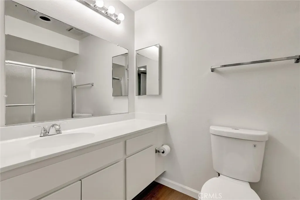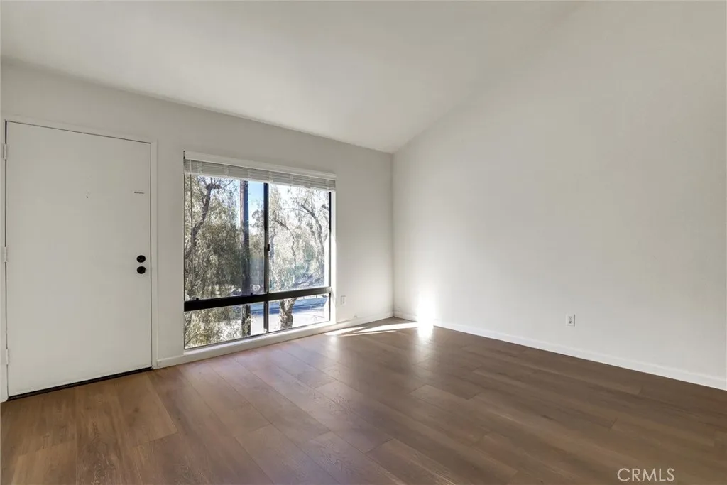 The interior has been completely refreshed with brand-new paint, wood laminate flooring throughout (no carpet), and new baseboards, creating a clean, modern aesthetic. Both bathrooms have been stylishly updated with newly finished counters, sinks, and sleek shower glass. Additional upgrades include all-new window treatments and screens, ensuring comfort and move-in readiness.