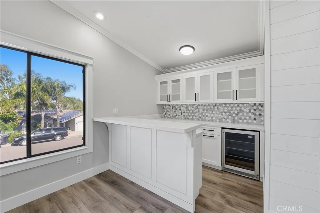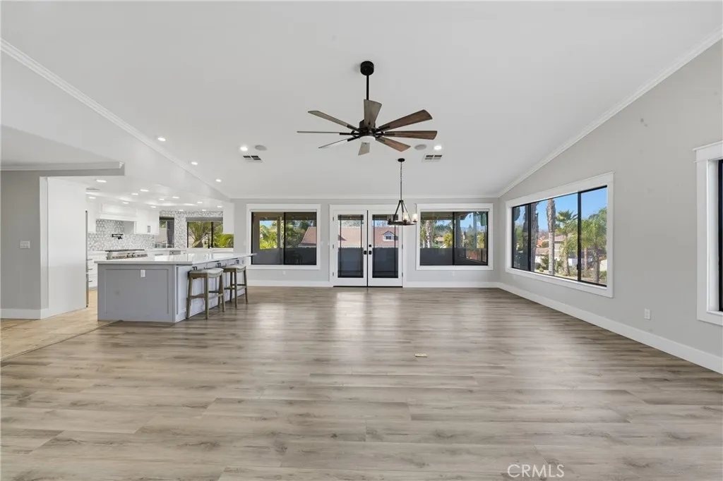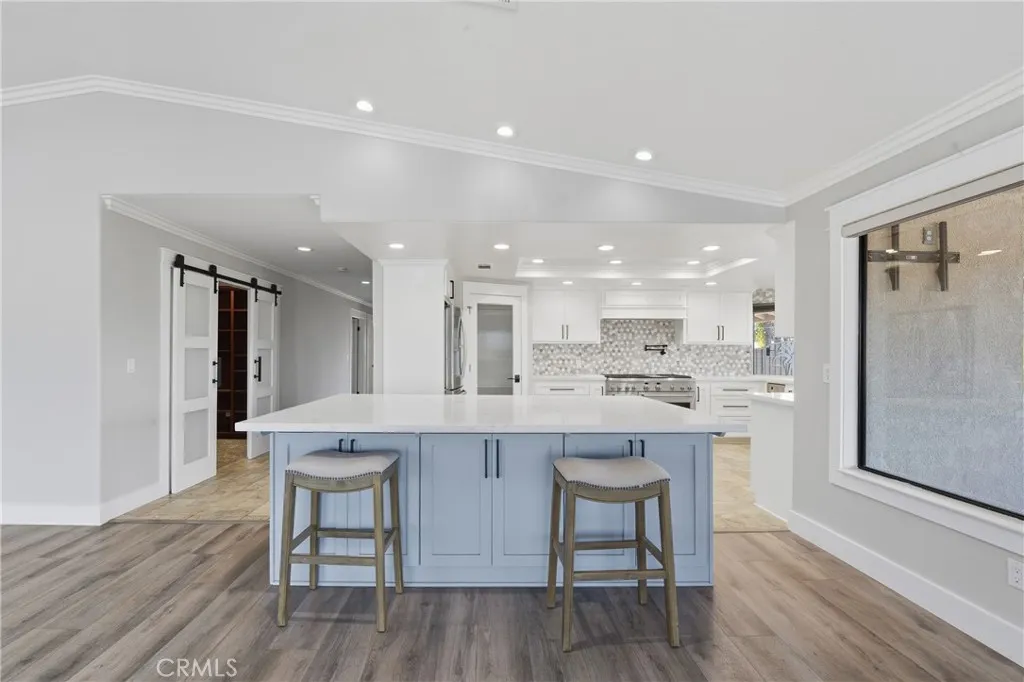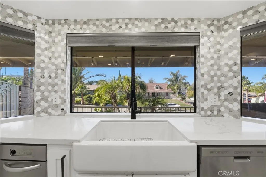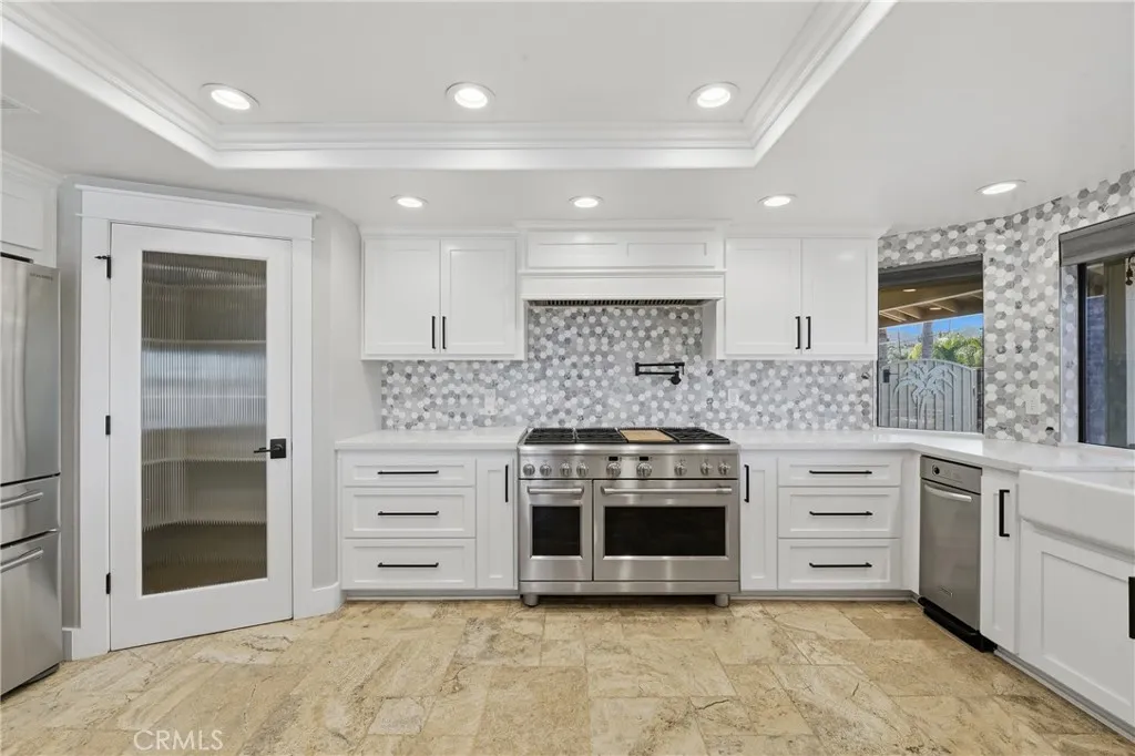 The chef’s kitchen is a true showpiece with quartz countertops, an oversized island, premium stainless-steel appliances, double ovens, a six-burner cooktop with griddle and pot filler, pull-out storage, and custom finishes — all flowing seamlessly into the dining and family rooms, highlighted by a statement fireplace, built-in mini bar with wine refrigerator, and expansive backyard views.