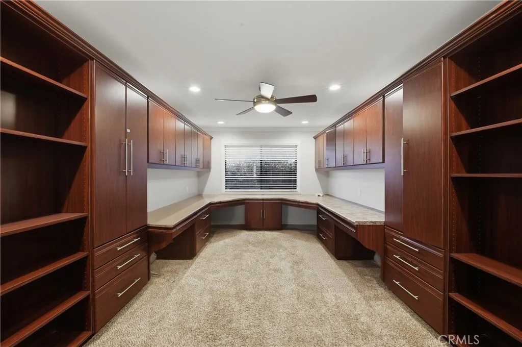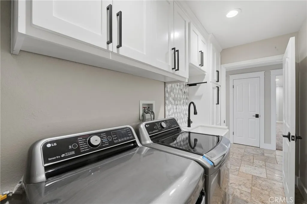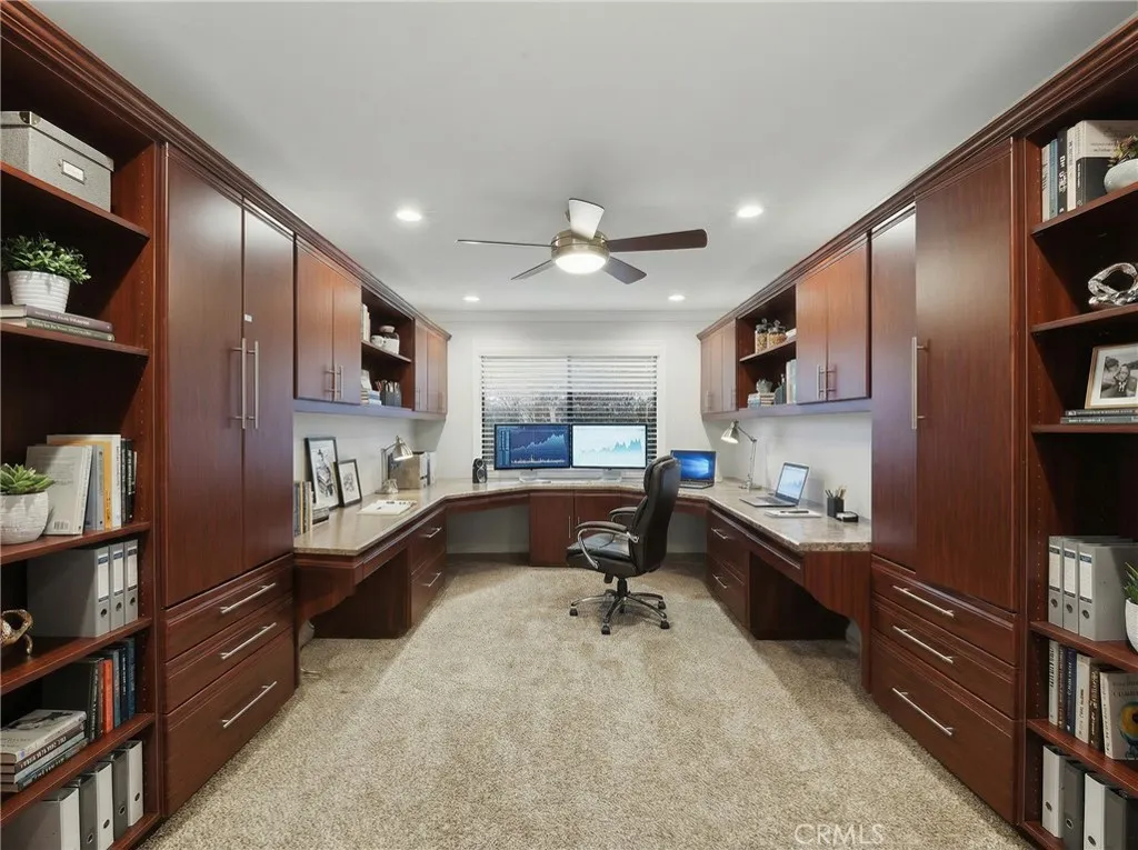 The primary suite is a private sanctuary with custom cabinetry, a spa-inspired bath featuring a jetted soaking tub and walk-in shower, and a generous walk-in closet. The office features stylish barn doors and custom built-ins, ideal for working from home or creating a private study. An indoor laundry room with sink and extra storage adds everyday convenience.