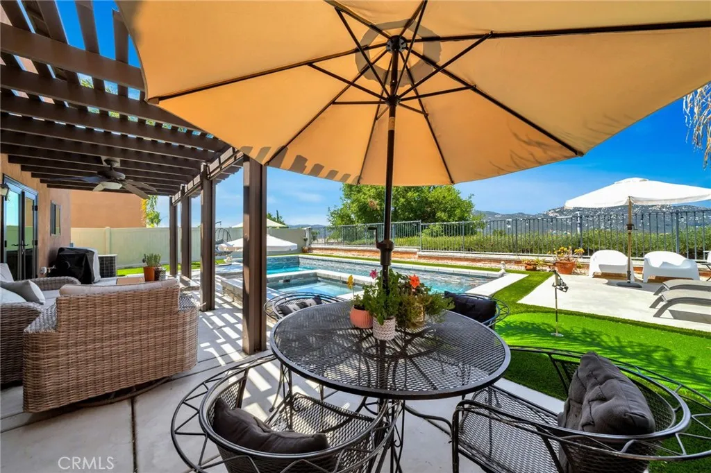 Welcome to this tranquil Temecula Retreat! Draped in style, charm, and comfort, this beautifully upgraded pool home is nestled in the Redhawk Community, one of Temecula’s most desirable communities. Featuring gorgeous vinyl flooring, neutral paint, and elegant white riser stairs, this home exudes warmth and modern sophistication throughout. Upstairs, you’ll find a huge bonus room perfect for a playroom, gym, media room, or home office, along with four spacious bedrooms, offering ample space for family and guests, including the Primary Retreat with it’s ensuite bath, spacious walk in closet and gorgeous views of hills, neighborhood and Pechanga Resort. The remodeled kitchen is an entertainer’s dream, stylish and functional with modern finishes, including a gorgeous center island that opens to the Great Room/living Room. The updated baths are equally impressive, designed with darling upgrades that add a touch of luxury and style to your daily routine. Outside you will find your own personal oasis, featuring a sparkling Pebble Tec pool and spa, covered patio, and even a putting green where you can practice your swing while enjoying panoramic views of the surrounding hills and neighborhood.