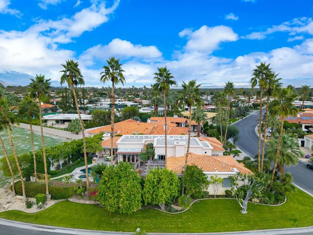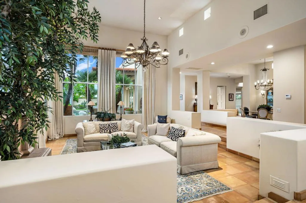This property offers stunning views of the southern mountains and features impeccably maintained landscaping. The home includes four bedrooms–one with built-in cabinetry suitable for use as an office–and four ensuite bathrooms, in addition to two half baths (a powder room and one conveniently located near the pool area). Upon entry, a step-down living room with a fireplace, high ceilings, and dramatic windows creates an inviting atmosphere. Adjacent is a formal dining room complete with a wet bar. The kitchen is equipped with granite countertops, stainless steel appliances, and a central island, adjoining both a breakfast area and a spacious den with a fireplace. The master suite features French doors opening onto a covered patio that overlooks the serene private yard. The master bath provides a generous walk-in closet, double vanities, and a sauna. Many rooms offer views of the expansive, lush backyard, which boasts a tropical-style pool and spa with vistas of Mt. Eisenhower. Call for your private showing.