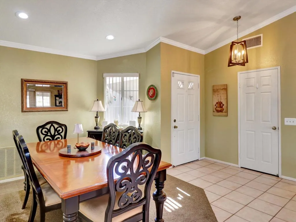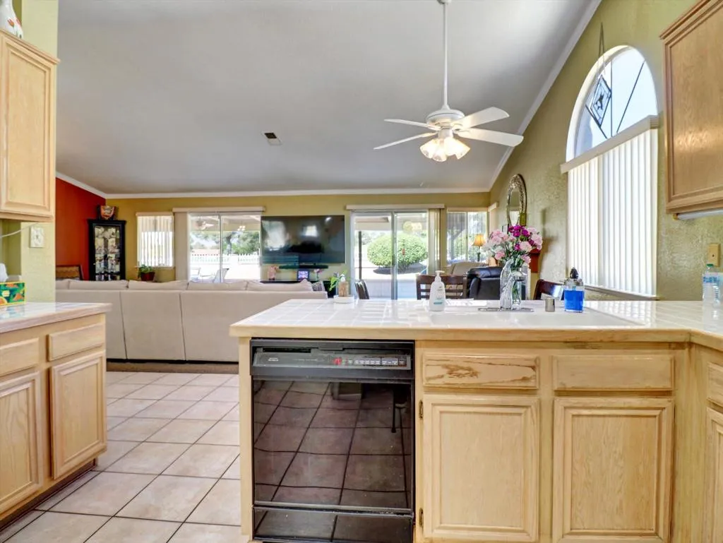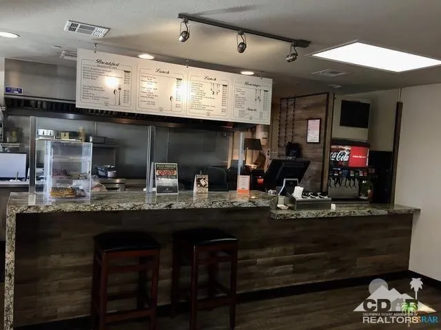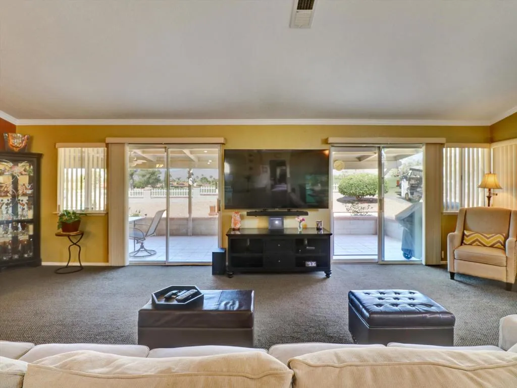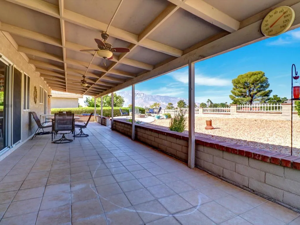 Very nice three bedroom two and 1/2 bath home on the 14th green in Mission Lakes Country Club This home offers a brand new A/C unit purchased and installed at 25K. The home is well maintained with a spacious living area including kitchen and dining and has two large sliders that lead to the back yard. The master bedroom offers the perfect on suite and has a slider off to the back patio. There is a large walk in closet and bathroom has tub dual sinks and shower. There is a fully covered patio, a fire pit area and the views of the mountains from the back yard are spectacular. You can enjoy evenings watching a beautiful sunset after playing a round of golf on an 18 hole Ted Robinson Championship golf course. Mission lakes has many amenities like heated pool, spa, tennis, fitness center, clubhouse, pro shop, restaurants and so much more. Vacation like living at its best. The best thing is the Low HOAS of only 506 a month and 600 a year to be spent for food. The 506 includes unlimited golf for two on title!