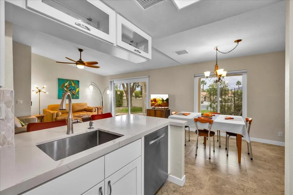 Welcome to the highly desirable Rio del Sol ”Las Casitas” community. This beautifully updated 2-bedroom, 2-bath condo offers a perfect blend of comfort, style, and indoor-outdoor desert living.The home features an updated kitchen with modern finishes including quartz counter tops, newer cabinets and appliances. There are two tastefully updated bathrooms, creating a move-in-ready experience. Enjoy two generous private outdoor spaces, ideal for relaxing, entertaining, or dining al fresco and is ideally positioned on an open green space with mountain views.Additional highlights include owned solar, a newer HVAC system, all new windows and doors, a one-car garage with a car charger outlet and is finished out with insulation and drywall, all within a thoughtful layout. Located in a well-maintained community that includes 3 pools/spas, a dog park, tennis courts and 2 ponds. Whether you’re looking for a full-time residence, second home, or investment property, this Casitas condo delivers desert living at its best.