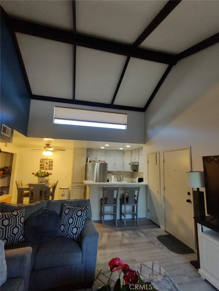 Beautiful, bright corner-unit condo featuring 2 bedrooms and 2 bathrooms. The primary bedroom offers a private en-suite bath and walk-in closet, while the second bedroom is conveniently located near the hallway bath. The spacious living room showcases high vaulted ceilings with wood paneling and abundant natural light. The open-concept kitchen connects seamlessly to the dining and living areas and features stainless steel appliances, a white stove, and an in-unit washer and dryer—ideal for entertaining. Custom features include a wall cabinet bar and a built-in Murphy bed, adding functionality and style. Laminate flooring throughout. Enjoy a private balcony with pool and greenbelt views, along with a small storage area. Two conveniently located parking spaces included. HOA amenities include a pool and spa. Walking distance to shopping, theaters, and restaurants, with nearby hiking and biking trails and easy freeway access. Very unique touches throughout. Move-in ready.