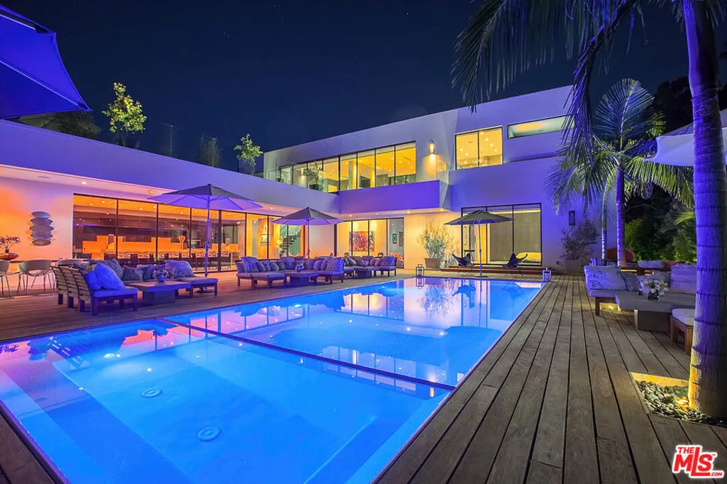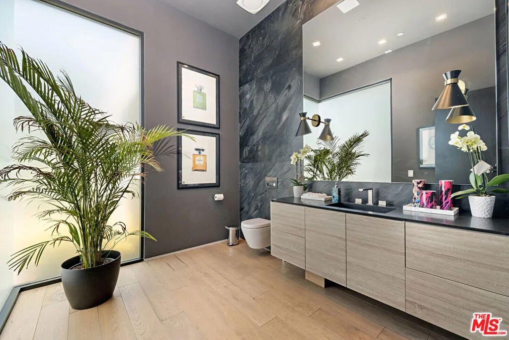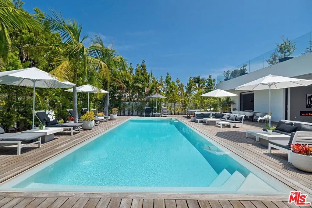 Walk through a perfectly landscaped front yard to enter an entertainer’s paradise! The grand spacious floor plan offers open living & dining areas w/ high ceilings, & marble floors throughout. The staircase with glass paneling takes you up to a private master suite w/ a lounge area that features a dual sided contemporary fireplace, textured tile walls, bright hardwood floors & glass doors that guide you to a private 2,000 sqft terrace that overlooks the pool area along w/ spectacular city views. The master suite features dual bathrooms, one w/ a romantic bath tub, sliding glass doors to a large balcony, both w/ glass showers, marble walls & floors that leads to an ultra modern, avant-garde walk-in closets. The bright & light kitchen has a 15ft island w/ bar seating , w/ top of the line appliances, dual sinks, wine cooler, and floor to ceiling windows that lead to the pool area. This architectural masterpiece is perfect for enjoying the Beverly Hills lifestyle!