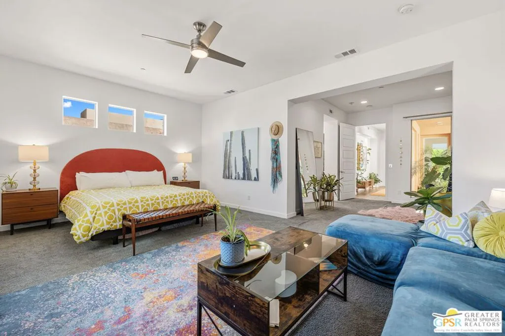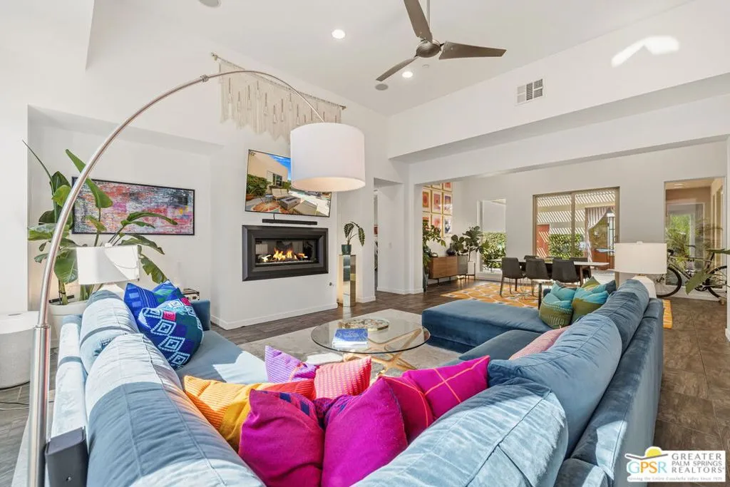 Wow! Bold architecture meets relaxed desert living in South Palm Springs. Set on one of the largest lots in the Luminaire community, this ultra-private residence captures the essence of modern Palm Springs living with expansive outdoor areas and mountain views. Offering more than 2,400 square feet of living space with OWNED SOLAR, the home features an airy, light-filled layout designed for comfort and separation of space. The living and dining rooms showcase 14-foot ceilings, a sleek fireplace, and walls of glass that frame both front and rear patios. The chef’s kitchen is beautifully equipped with a large island, double ovens, a 5-burner gas cooktop, rich walnut cabinetry, and abundant storage. Outdoors, privacy and serenity define the experience. The spacious backyard features a saltwater Pebble Tec pool and spa, lawn area, and multiple patios perfect for entertaining. The front courtyard, complete with a misting system, provides another inviting space to relax and unwind. With only one close neighbor, this property offers exceptional privacy and views in every direction. LOW HOA FEES and land you own make this polished home a rare find. Take the Matterport Virtual Tour for a better sense of flow. Luminaire is an exceptional community known for its pride of ownership and walkability in the heart of Araby Commons.