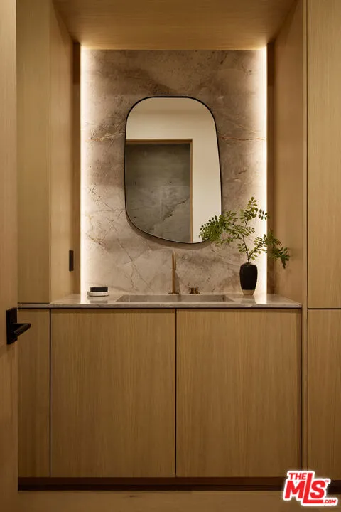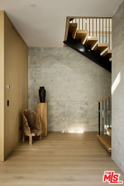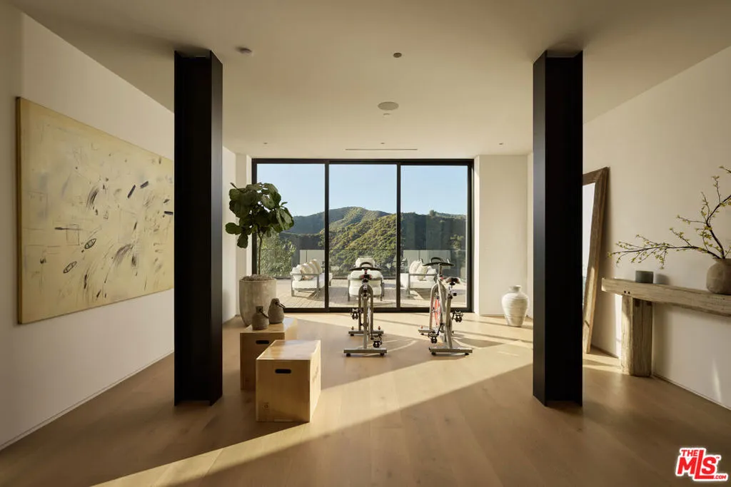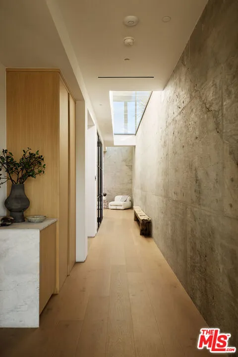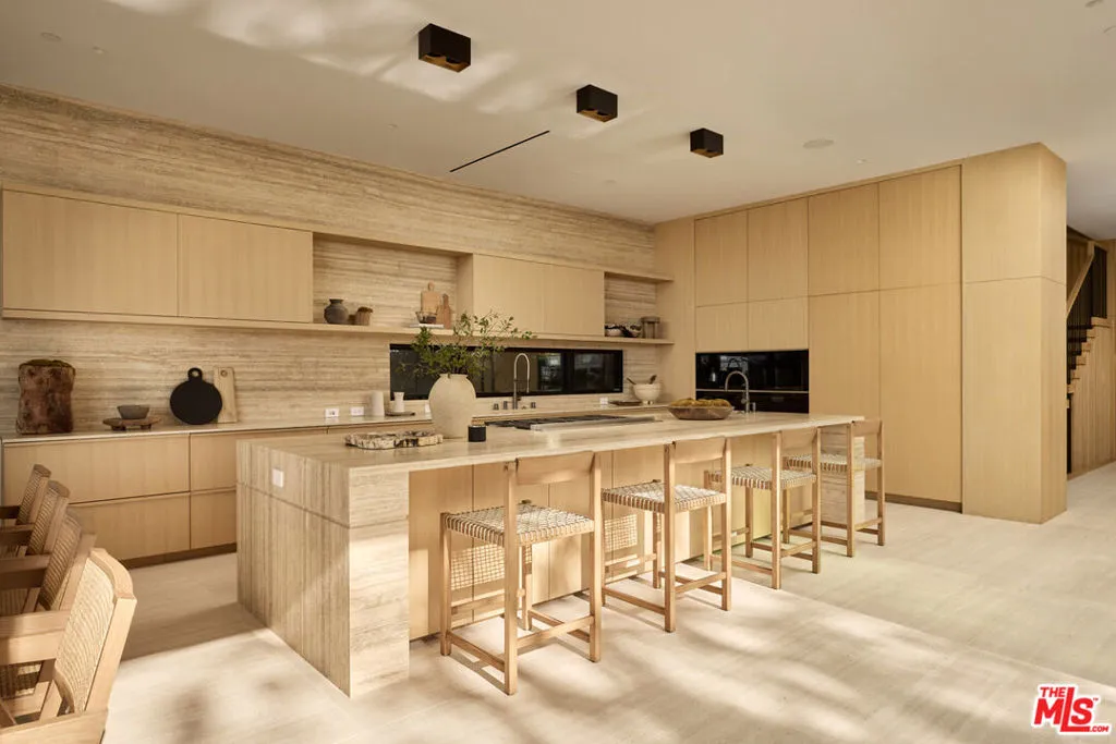 The Glassridge Residence. A Tadao Ando inspired organic modern with walls of glass that open to ocean and Getty views. Privately gated and set along one of Bel Air’s most prominent ridgelines, the estate was newly completed in 2025 by Studio MD – AIA, with interiors by James Rosen. The main level is conceived as an open-plan environment with soaring 12′ ceilings and sliding glass walls that connect living, dining, and kitchen spaces directly to the surrounding landscape. The kitchen reads like a gallery installation, featuring full-height travertine surfaces, a 15′ waterfall island, and seamless, handle-less cabinetry that conceals an integrated Miele appliance suite, including double ovens and a built-in espresso machine. On the top level, a private vestibule with a stone-clad prep bar, integrated sink, and refrigerator precedes the primary suite, creating a quiet transition before the view reveals itself. Designed to honor its breathtaking setting, the bedroom is lined with floor-to-ceiling sliding glass walls that open to a wraparound private terrace, extending the suite outdoors and framing uninterrupted hillside and ocean views. The en-suite bath is resort-caliber, finished in travertine with a freestanding soaking tub, walk-in shower, and custom double floating vanities. A linear skylight draws natural light into the space, while a custom walk-in closet sits adjacent, integrated with matching wood millwork. The lower level is organized as a sequence of architectural moments featuring a linear corridor set against an exposed board-formed concrete wall, left intentionally raw, accented by wide-plank oak flooring. This level includes a private three-tier theater, temperature-controlled wine room, gym and steam shower, bar and lounge area that opens to a separate outdoor deck, all designed as a self-contained environment for leisure, wellness, and entertaining. A fully integrated Control4 system manages lighting, climate, audio, and security. The backyard showcases a 41′ infinity pool that visually disappears into the landscape, flowing into a waterfall feature visible from the lower deck below. Lounge areas, dining zones, a built-in Alfa wood-fired pizza oven, grill, and a level lawn are arranged as distinct outdoor settings, all oriented toward the surrounding hills. 1149 Linda Flora Drive stands apart as an architecturally distinguished estate thoughtfully designed for privacy and wellness.