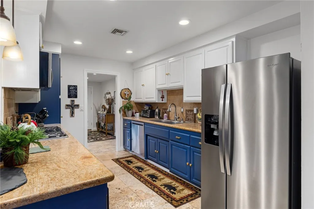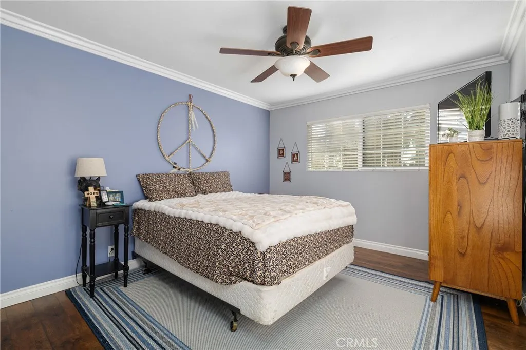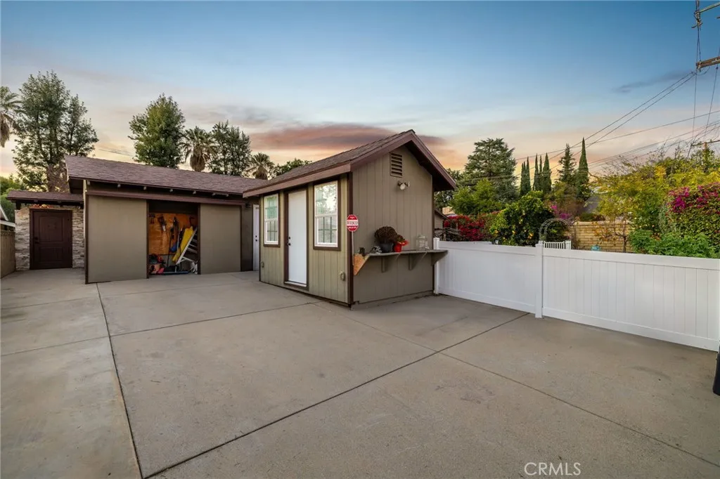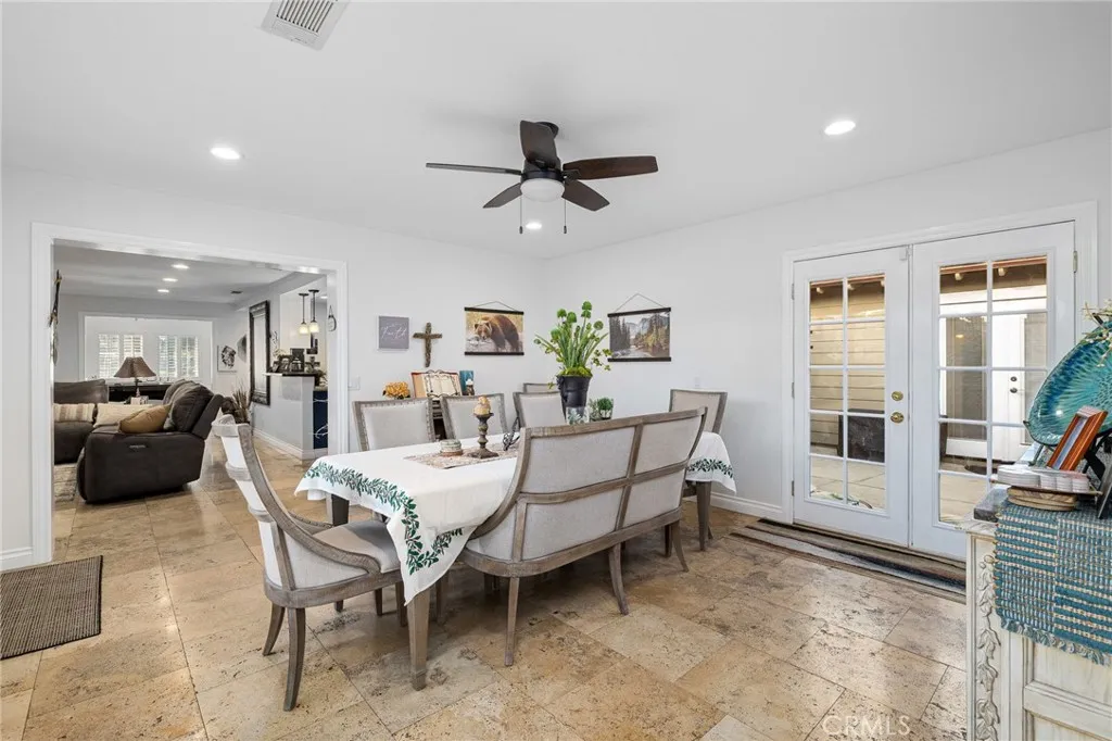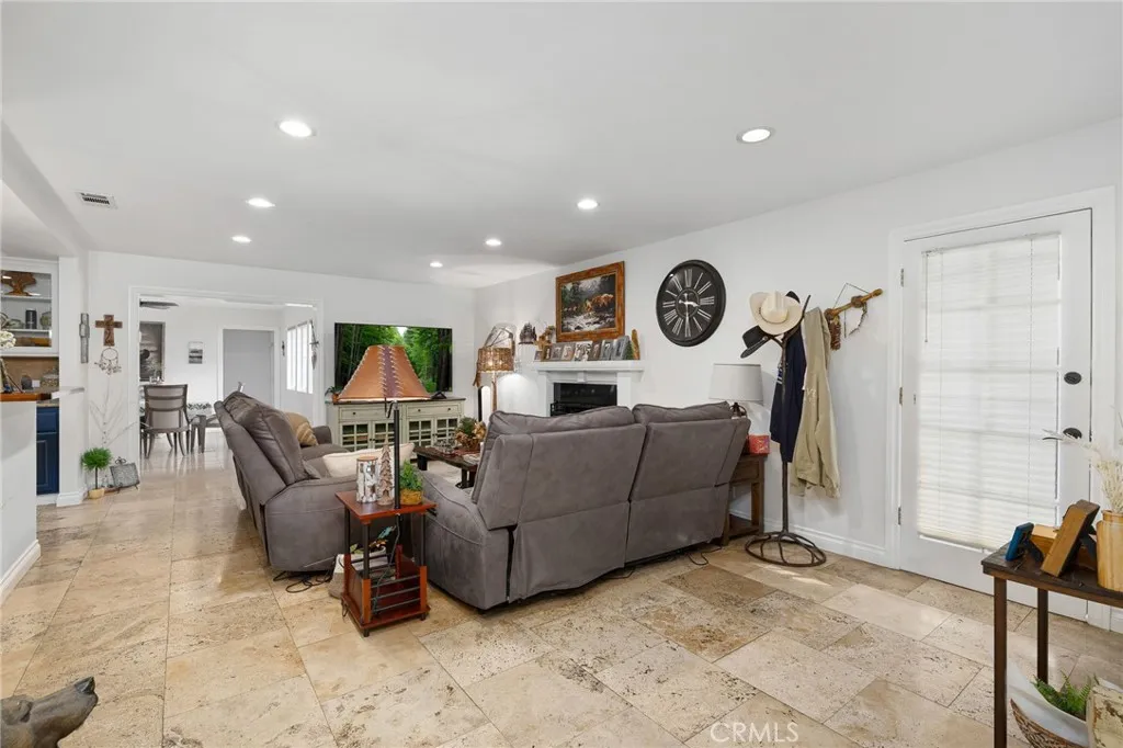 Beautifully remodeled single-story residence on iconic Euclid Avenue, featuring paid solar and exceptional curb appeal. The meticulously landscaped front yard showcases brand-new artificial turf, illuminated planters, a covered pull-through drive leading to a private motor court and attached two-car garage, and a welcoming covered front porch. The home opens to a travertine-tiled entry and front living room with vaulted ceilings, recessed lighting, LVP flooring, plantation shutters, and an open connection to the family room. The family room offers travertine flooring, recessed lighting, a fireplace with mantel, and seamless flow into the kitchen. The kitchen features custom wood cabinetry with glass upper displays, granite countertops, stainless steel appliances, a walk-in pantry, and a peninsula with countertop seating and pendant lighting. Just steps away, the spacious dining room is highlighted by a wall of windows overlooking the backyard. An oversized laundry/mudroom provides abundant storage, natural light, and French doors leading outdoors. Down the extra-wide hallway, the primary suite is accessed through double entry doors and features wood-patterned tile flooring, recessed lighting, crown molding, plantation shutters, and French doors opening to the backyard. The spa-inspired primary bathroom offers dual sinks, a soaking tub beneath a chandelier, a dramatic full-height tiled accent wall that flows into a custom shower with frameless glass enclosure and dual shower heads, and a large walk-in closet with built-in organizers. Three additional bedrooms, all with crown molding, are served by a completely remodeled hall bathroom featuring dual sinks, a custom-tiled shower with frameless glass enclosure, and a freestanding tub. The attached garage is fully finished and includes flush-mount lighting, an EV charger, and attic access with pull-down ladder and overhead storage. The backyard is designed with brand-new artificial turf, stacked-stone perimeter walls, custom lighting, a built-in barbecue, an above-ground spa, and a garden area with mature fruit trees. A cul-de-sac alley provides access to an automatic gate leading to a spacious RV parking area with two storage sheds, separated from the main yard by vinyl fencing and a gated entry. Additional features include a new roof (May 2025), dual HVAC systems, tankless water heater installed in the attic, 200-amp electrical panel, alarm system, automatic sprinklers, and Ring doorbell.