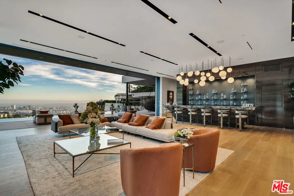Seller accepts crypto! Conceived and executed with the modern mogul’s ambition top of mind, this newly constructed palace offers sweeping, uninterrupted views of the canyon and Los Angeles skyline, spanning 500 feet of frontage in a coveted Bird Streets enclave. Enter beneath a bespoke chandelier and cascading fountains into a 13-foot living room anchored by layered stone fireplaces. The Arclinea kitchen opens to a European-inspired wine room illuminated by a sculptural pendant. Floor-to-ceiling glass panels dissolve the line between indoors and outdoors, revealing expansive terraces with an 18-foot sunken fire pit, a 100-foot infinity pool, a 30-person spa, and a sand volleyball court, each set against sweeping vistas. The primary suite serves as a private retreat, featuring a reading vestibule, a 1,500-square-foot balcony with Jacuzzi and fire features, dual dressing rooms, and a travertine-clad bath with twin soaking tubs and panoramic views. Tailored for both comfort and spectacle, the home also includes a command center-style office, a full screening room, a gym, hookah and meditation lounges, a panic room, a shoeshine station, and more. Designed with intent, the residence is as functional as it is striking. Revel in the pinnacle of modern elegance, all while being enveloped by some of Southern California’s most breathtaking views.