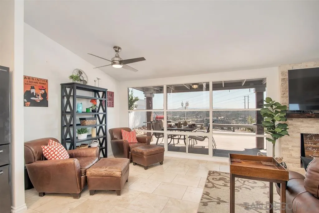 Upgraded single level home with gorgeous views of Mission Valley from a giant backyard composite deck. Large windows and vaulted ceilings brighten the home and showcase an open floor plan. Travertine flooring and wood like laminate in the bedrooms, this home has central A/C and nicely upgraded with matching stainless appliances and a spacious primary bathroom. Enjoy cool breezes with ceiling fans throughout. Beautiful views of Snapdragon Stadium!
