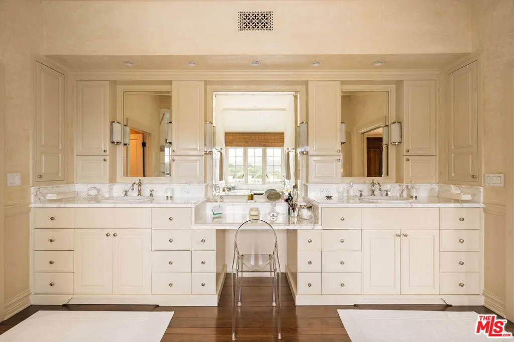 Elegant Bel Air Estate with Tennis Court, Pool & Timeless Charm! Set behind gates on a generous 25,969 SF lot, this timeless Gerard Colcord residence offers classic design, modern comforts, and exceptional amenities in one of Bel Air’s most coveted enclaves. With approximately 5,616 SF of living space, the home features 6 bedrooms and 5.5 bathrooms, blending character-rich details, such as custom millwork, vaulted ceilings, and four fireplaces, with thoughtful updates including a new generator, central vacuum system, and integrated audio-visual wiring. The heart of the home is a chef’s kitchen with Calacatta marble counters, top-of-the-line appliances, and a separate butler’s pantry/scullery kitchen, perfect for entertaining with ease. The multiple living areas include a gracious formal living room with wood-beamed ceilings, a cozy den with wet bar, and a sunlit family room. Upstairs, the serene primary suite offers sweeping views, a fireplace, a spacious sitting area, balcony, huge closet, and a spa-like bath with a soaking tub and Calacatta marble shower. The incredible park-like grounds are designed for both recreation and relaxation. A full-size tennis court with basketball hoop, a pool and spa with Bluestone decking, and patio with retractable awnings create the ultimate indoor-outdoor lifestyle. Mature landscaping and privacy hedges frame the property, offering a tranquil retreat that’s a short drive to Brentwood, Beverly Hills, Westwood, and more!