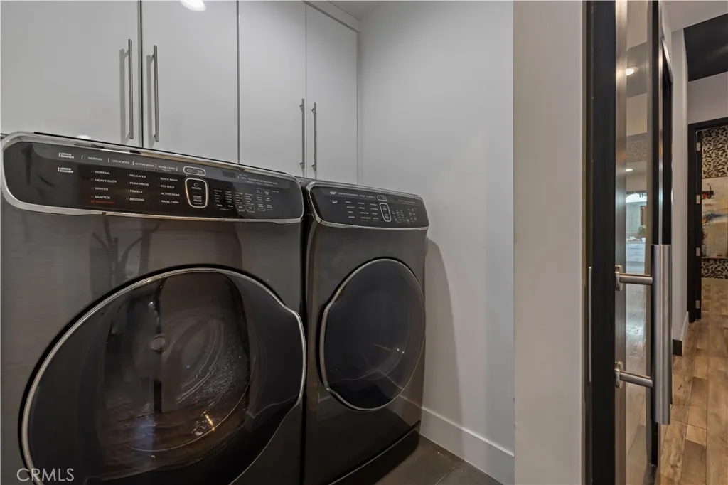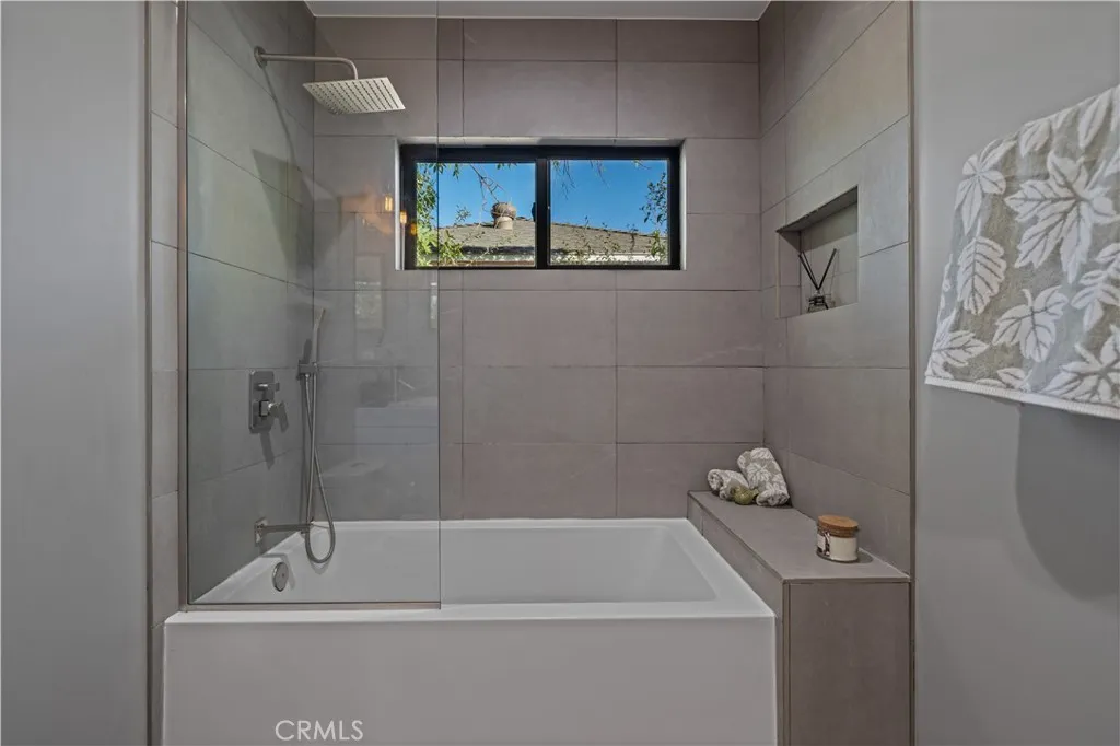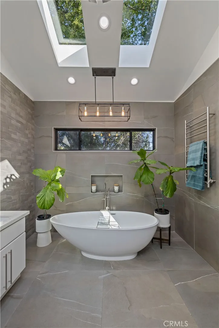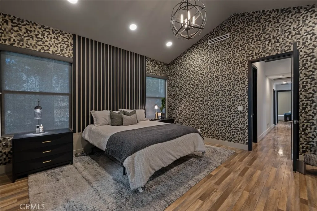 The primary suite is a private sanctuary, showcasing vaulted ceilings, exquisite wallpaper, and an elegant accent wall behind the bed. Dual walk-in closets with custom built-ins offer exceptional storage, while the lavish primary bathroom exudes spa-like tranquility. Featuring a dual vanity, an oversized shower with double rain shower heads and two hand sprayers, a large soaking tub, a wall-mounted towel warmer, and four skylights complemented by recessed lighting and accent chandeliers, this space is designed for ultimate relaxation. Additional accommodations include beautifully finished secondary bedrooms with large closets, a stylish half bathroom with an accent tile wall, and a secondary full bathroom featuring rain shower heads and a hand sprayer. A secluded guest suite provides flexibility for use as an office, playroom, or additional bedroom, complete with its own designer bathroom and walk-in shower. Step outside to a private backyard retreat featuring a wood deck and freshly landscaped grounds—an ideal space for outdoor entertaining or peaceful relaxation. This home perfectly blends sophisticated design with thoughtful technology, featuring a full suite of smart features including app-controlled security, video doorbells, smart thermostat, lighting, irrigation, and appliances. With voice assistant integration, enterprise-grade Wi-Fi, and universal smartphone control, this home is fully connected and future-ready.