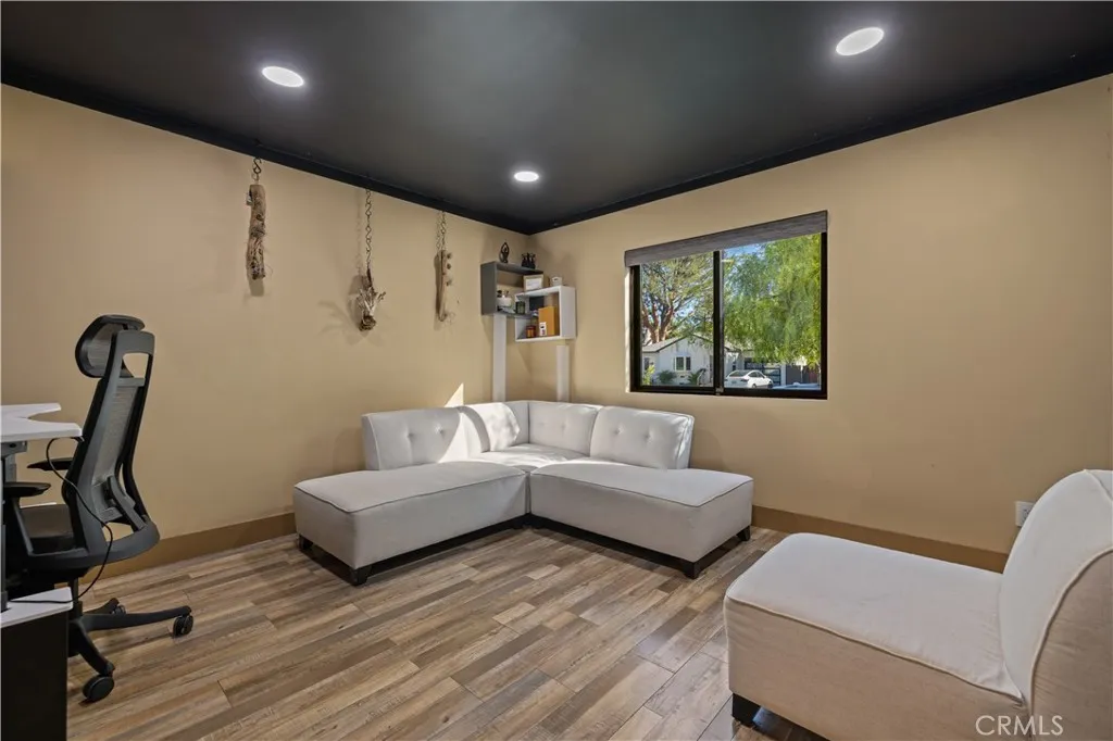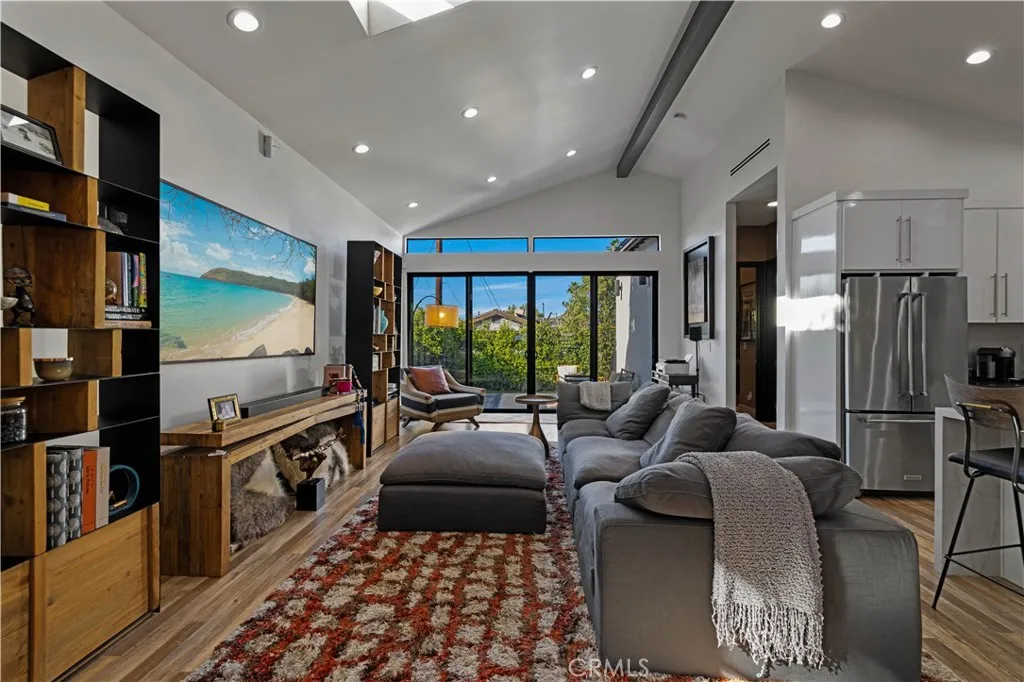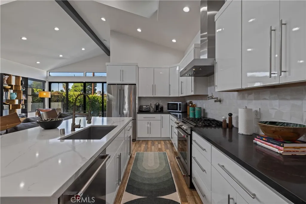 Welcome to 17929 Martha Street, an exquisite smart home where comfort, sophistication, and style are paramount. From the moment you arrive, thoughtfully curated finishes and designer touches elevate every space. The formal living room, overlooking the lush front yard, offers a calm and inviting setting for guests, while a large barn door provides a seamless transition between this cozy retreat and the expansive great room. The great room serves as the heart of the home, creating an elegant setting for dinner parties and luxury entertaining. The large kitchen is a true centerpiece, featuring abundant cabinetry, striking black quartz countertops, and an oversized waterfall island with seating for up to six. A pot filler above the stove adds both convenience and a touch of modern luxury. The expansive family room is flooded with natural light, highlighted by vaulted ceilings, large picture windows, dormer windows, and stationary glass panels that frame wall-to-wall sliders—perfectly blending indoor and outdoor living.
