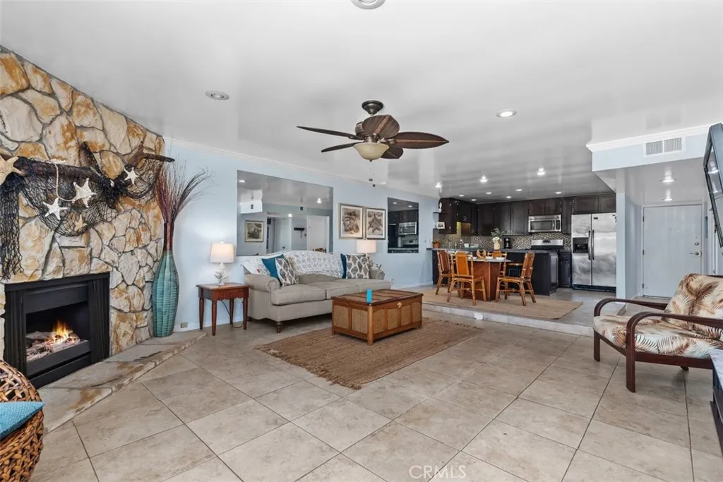 Coastal retreat in the resort living Ocean Fairways community, offering ocean, sunset, golf course, and city lights views. This charming and cozy one bedroom condo features an open-concept kitchen and living area designed for relaxed seaside living, complete with concrete countertops, stainless steel appliances, breakfast bar, recessed lighting, and a cozy gas fireplace.