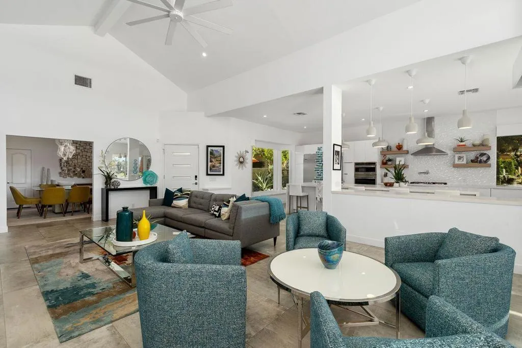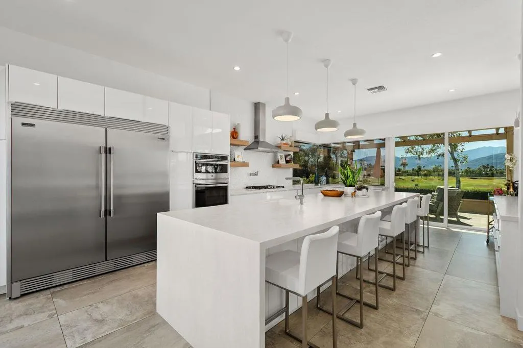 A beautifully reimagined Evergreen model in the coveted Mission Hills / Deane Homes enclave, this free‑standing, single‑story, fee‑simple home delivers the rare combination of architectural presence, modern luxury, and panoramic, unobstructed southern views. With 4 bedrooms and 3.5 baths–including three en‑suites plus a flexible fourth bedroom/dining room –the layout caters effortlessly to both privacy and entertaining.Extensively remodeled and completed in 2019, the home sits high above the 6th Fairway of the Pete Dye Westin Resort Course, capturing breathtaking vistas through frameless kitchen windows and expansive living spaces. The showpiece kitchen features new custom cabinetry, Neolith countertops with porcelain backsplash, a 14‑ft island seating 5-7, 60” built0in stainless refrigerator, stainless cooktop, built‑in oven with warming drawer, microwave, pot‑filler, beverage cooler, Ice‑O‑Matic pearl ice maker, deep Kohler sinks, Grohe faucets, and dual Woder filtration.The living room impresses with vaulted ceilings, an oversized ceiling fan, and a sleek Dimplex electric fireplace, all oriented toward the sweeping fairway and mountain views. Every bedroom and bath has been redesigned, including a spa‑inspired primary suite with glass‑walled shower, Neolith counters, Hansgrohe fixtures, and towel warmers.Major upgrades include 24”x48” tile flooring throughout, newer HVAC and ducting, newer enhanced energy‑efficient windows, LED lighting, fully replaced plumbing, motorized window coverings, and 32 owned solar panels. The air‑conditioned 3‑car garage offers EV charging, updated flooring, and a newer Bradford White water heater.HOA amenities include trash, cable, internet, guard‑gated security, and four community pools. Just a short golf‑cart ride to Mission Hills Country Club and the Westin Resort, with golf, fitness, tennis, and pickleball memberships available.