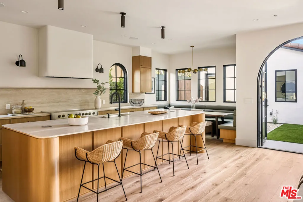 Experience bespoke luxury in this custom-built, modern Mediterranean estate, where exquisite craftsmanship meets timeless design. Sited on a 7,000+ SF lot near premier dining, shopping, and cultural destinations, this new construction residence offers a rare blend of elegance and functionality. A handcrafted wood entry door welcomes you into a grand double-height foyer, featuring checkerboard tile flooring, custom built-ins, and a stunning skylit staircase. Arched doorways lead to a formal living room with vaulted ceilings, while the adjacent dining room connects to a butler’s pantry for seamless entertaining. The gourmet kitchen is a chef’s dream, boasting a large island with Travertine counters, top-tier appliances, white oak cabinetry, and a built-in breakfast banquette. The open-concept den features arched steel doors that open to the entertainer’s patio, complete with outdoor dining, a pool, spa, and a fully permitted ADU, perfect as a guest suite or private retreat. Conveniently located on the first level, a private bedroom with an ensuite bathroom offers flexibility for guests or multigenerational living. Upstairs, the primary suite impresses with vaulted ceilings, a spa-like bath (fluted cabinetry, slab walls, soaking tub), and dual closets. Two additional ensuite bedrooms, a laundry room, and a spacious office complete the upper level. Notable features: Gated entry, secured parking for 3 cars, designer lighting, artisanal tilework, rich wood accents, and a stately mature pine tree. This home is a true celebration of refined living.