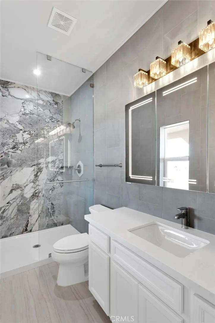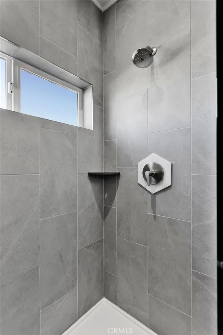 Interior finishes include fully insulated interior walls, porcelain tile flooring throughout, quartz countertops and window sills, solid-core custom doors, Kohler fixtures and fully insulated garages. Each room is equipped with a fire suppression system and room-by-room climate control via high-efficiency mini-splits. The kitchen is designed for both functionality and efficiency, featuring a spacious island, cabinetry with convenient slide-out shelving, and a high-performance induction range. A large glass-door pantry with a built-in freezer provides ample storage and adds to the kitchen’s thoughtful, modern design.