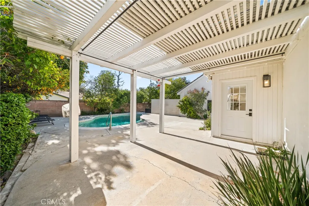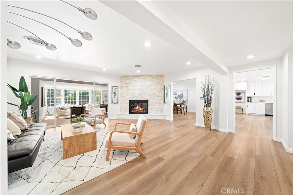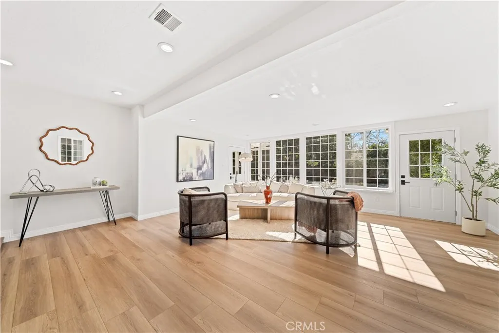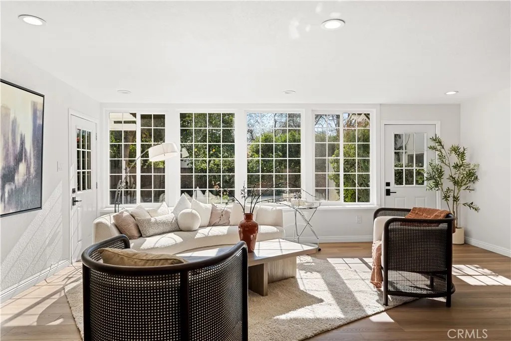 This home features a spacious sunroom ideal as an additional living area or home office, separated by elegant glass doors. Two living rooms offer a flexible open layout with abundant natural light from large glass windows. The sunroom overlooks the backyard pool and fruit trees, creating a relaxing and enjoyable atmosphere.