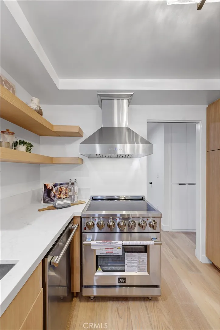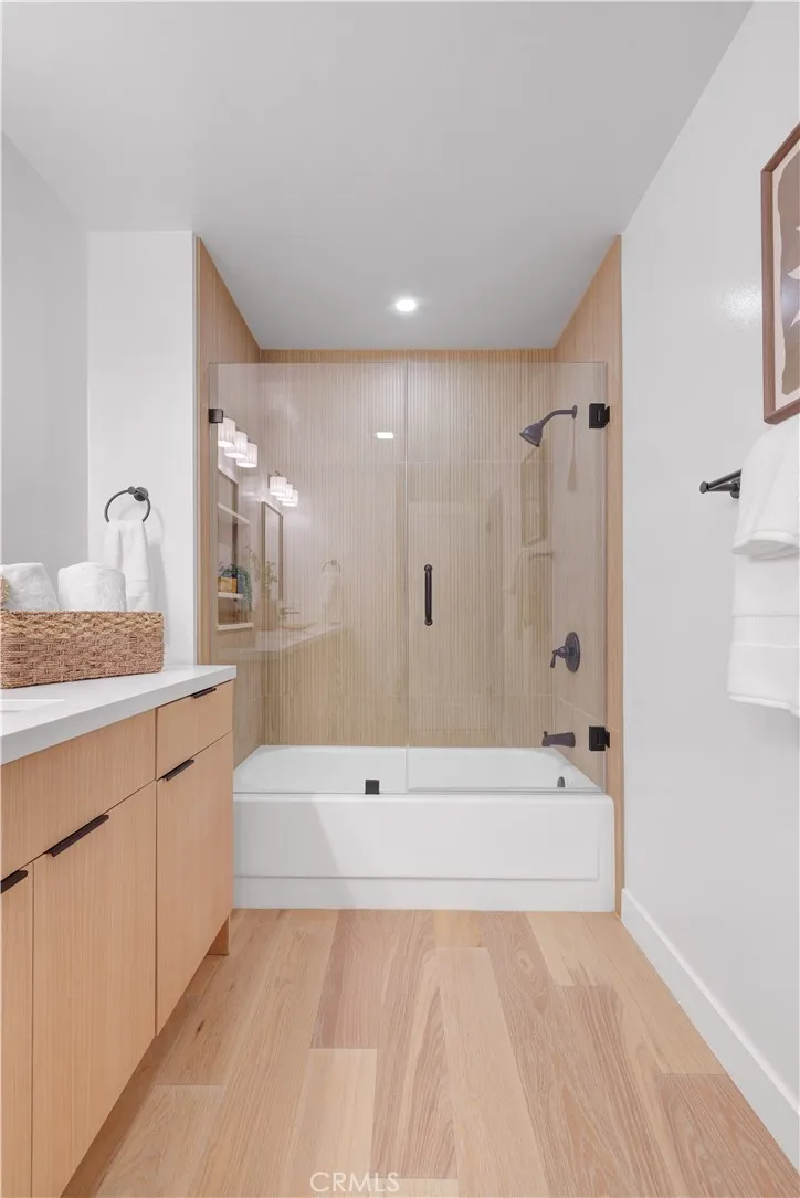 The open-concept living area is adorned with new engineered-wood flooring, which is celebrated for its water resistance, and shows off a wall of windows that slide open to a private balcony. The space is illuminated by fresh recessed lighting and a newly skim-coated ceiling and complemented by new interior doors with sleek black hardware. Cozy up by the new electric fireplaces or enjoy the breeze from brand-new ceiling fans as you take in the stunning ocean vistas. The kitchen is a true showstopper, featuring custom Maplewood and Rift White Oak cabinetry, highlighted by sleek quartz countertops and breakfast bar with open shelving. All new stainless steel appliances will elevate your culinary experience including a built-in microwave drawer, 6-burner gas range, and matching stainless steel range hood. Natural light floods the bedrooms and the primary suite bathroom offers a serene retreat with dual vanities and a soaking tub. Both bathrooms have been fully upgraded with Spanish-style ceramic tile, quartz counters, and modern fixtures. Washer and dryer hookups are located inside the unit.