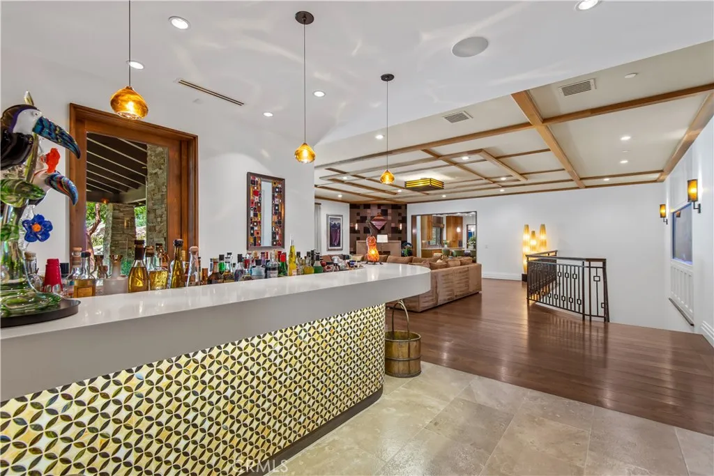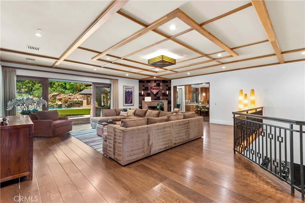 A wonderfully private, nearly 3 acre lot showcases this stellar, privately gated custom estate where “Frank Lloyd Wright meets Mondrian” complete with its own tennis court, a swim through outdoor/indoor pool with swim jets, waterfalls, waterslide & spa, over twenty fruit trees, organic vegetable garden, big outdoor patio with fireplace, and an observatory with a 14″ reflector telescope. Interior highlights include a beautiful chef’s kitchen with dual islands & large breakfast room, opening to the spacious family room with sliding walls of glass, plus an adjoining lounge with wet bar, beautiful living room with 25′ tall ceilings & Onyx wall, a built-in 750 gallon fish tank, an amazing, one-of-a-kind, Octo-light home theater with 19′ diagonal screen, plus a cantina bar, acoustically shielded music room, wine room, professional, entertainment grade game room, mirrored gym with deluge shower, steam & massage room, a children’s study and custom office. There are six en suite bedrooms including the superb primary suite complete with a glass encased shower, soaking tub, fireplace, and large walk-out balcony overlooking the lush private grounds. Additional amenities include a Crestron-controlled smart home system by Bliss Home Automation, a 24 kilowatt photo-voltaic solar system with energy monitor, rooftop solar heating system, an elevator, plus front and rear staircases, circular driveway, and two, 3-car garages. The grounds also include a half-basketball court, full barbecue center with wood-burning pizza oven, indoor/outdoor bar, firepit, a gentle hiking trail through the trees and to the observatory, and loads of entertaining space.