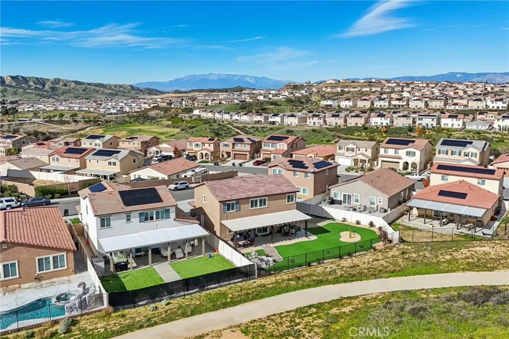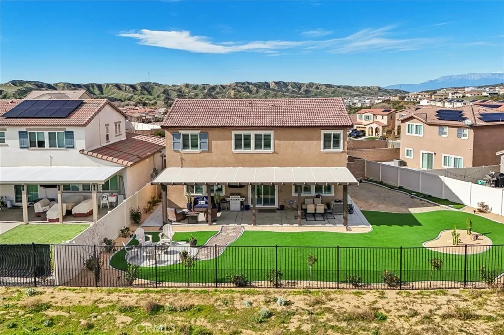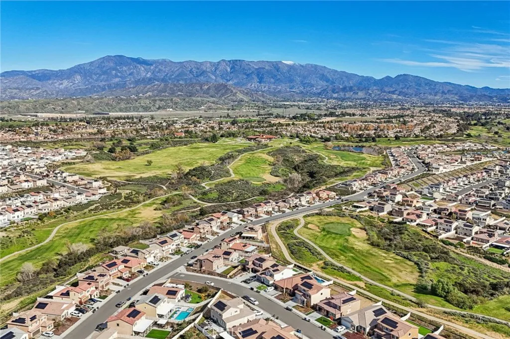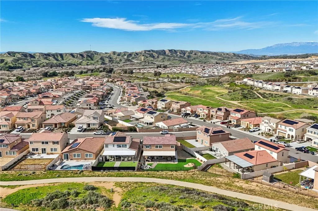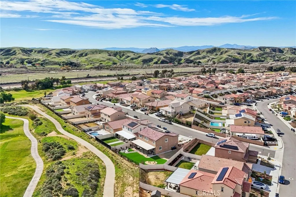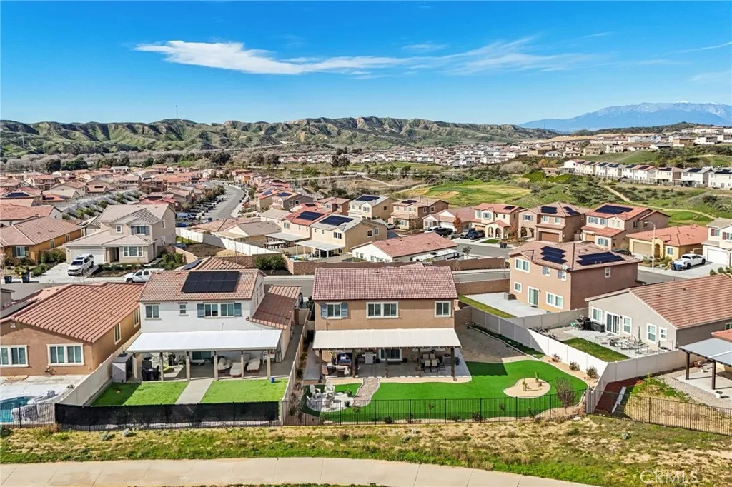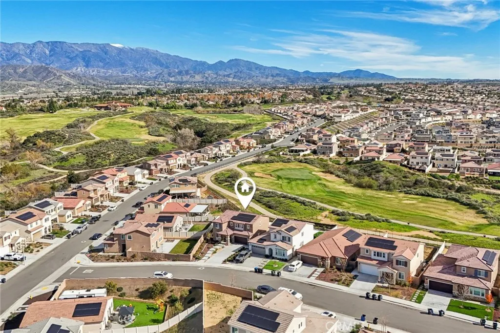Welcome to The Fairway Community, where you can experience modern resort-style living at its finest. This breathtaking premium corner lot home sits on an expansive 7,815 sq. ft. lot overlooking The Legends GOLF COURSE with stunning MOUNTAIN VIEWS—a rare find in today’s competitive real estate market. Properties in this sought-after neighborhood consistently trend above average for both appreciation and desirability, making this an exceptional investment opportunity as well as a dream residence. The exterior features self-maintaining landscaping, including turf, decorative rocks, vinyl fencing, and drought-tolerant plantings, ensuring both excellent curb appeal and easy upkeep. The outdoor space is perfect for year-round entertaining, featuring an Alumawood patio cover with recessed lighting, ceiling fans, TV, and a dedicated BBQ and dining area—ideal for hosting gatherings or relaxing with loved ones while enjoying the scenic backdrop. Inside, you’ll find a bright, open 2,239 sq. ft. floor plan with four spacious bedrooms and three full bathrooms. A convenient main-floor bedroom and bath provide an ideal space for guests or multi-generational living. The chef’s kitchen is a showstopper, featuring white cabinetry, stainless steel appliances, quartz countertops, and a large island with designer pendant lighting and extra seating. Upstairs, a large loft offers flexible additional living space, while a well-appointed laundry room with extra storage adds everyday convenience. The spacious master suite offers picturesque views, a large walk-in closet, and a luxurious bathroom featuring dual quartz vanities, a soaking tub, and a walk-in shower, creating your own private retreat. Additional features include earth-tone luxury vinyl flooring, wood plantation shutters, recessed lighting, and ceiling fans throughout. This meticulously maintained home is truly move-in ready that includes a tankless water heater and “OWNED SOLAR!”—a major value in today’s energy-conscious market. Residents of The Fairway Community enjoy resort-quality amenities, including a clubhouse, gym, two sparkling pools, a jacuzzi, a splash pad, a playground, and picnic areas. Schedule your private showing today and secure your place in one of the area’s most desirable communities!