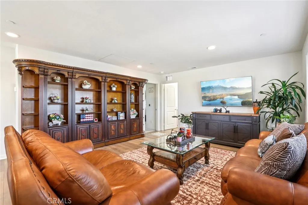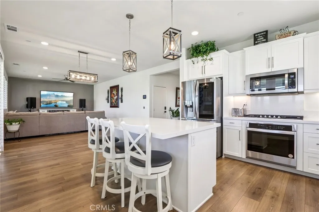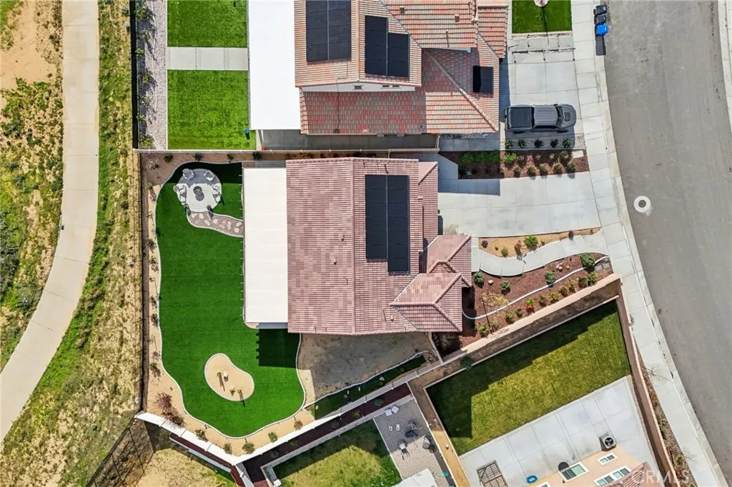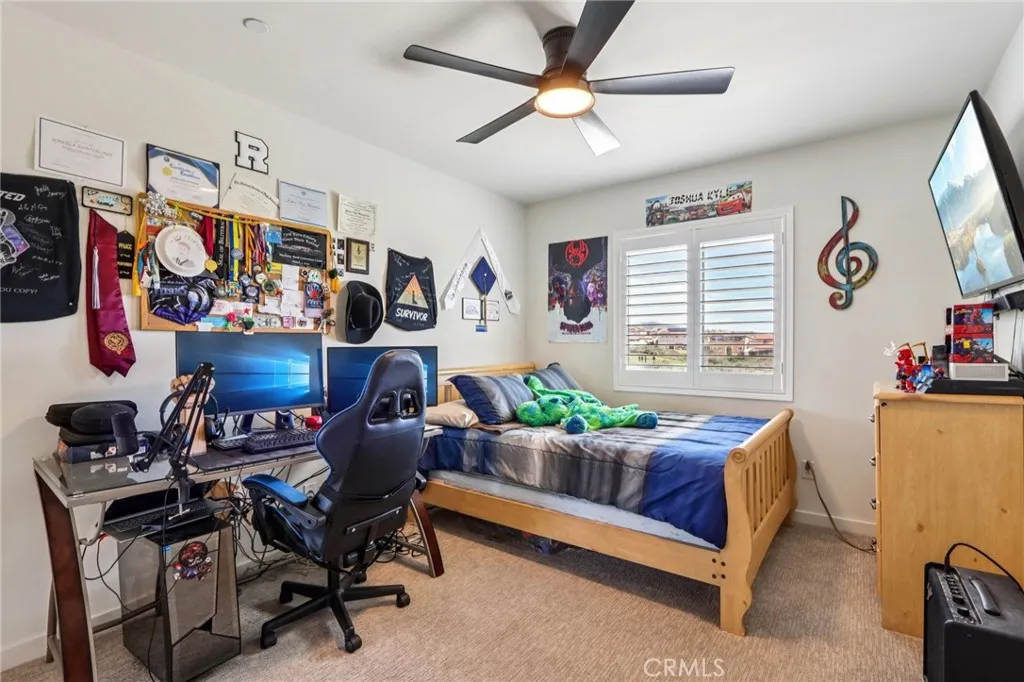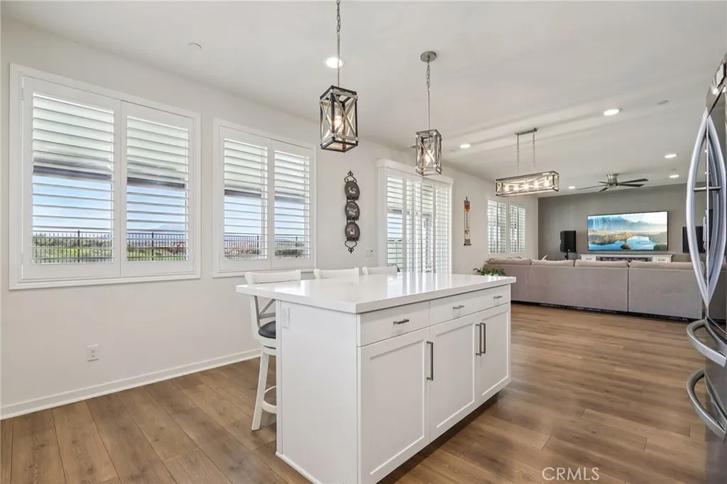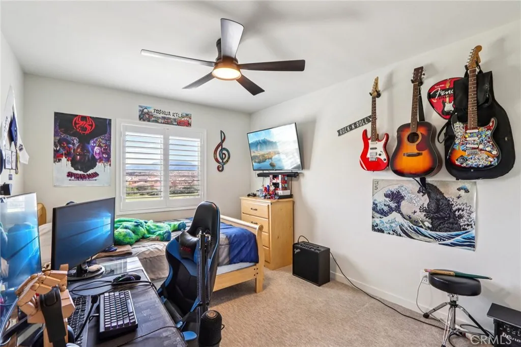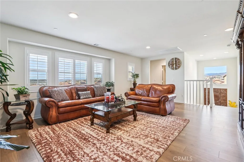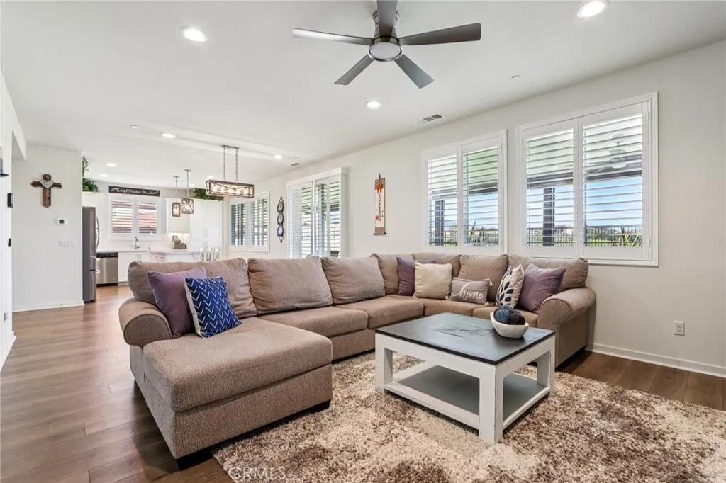 Welcome to The Fairway Community, where you can experience modern resort-style living at its finest. This breathtaking premium corner lot home sits on an expansive 7,815 sq. ft. lot overlooking The Legends GOLF COURSE with stunning MOUNTAIN VIEWS—a rare find in today’s competitive real estate market. Properties in this sought-after neighborhood consistently trend above average for both appreciation and desirability, making this an exceptional investment opportunity as well as a dream residence. The exterior features self-maintaining landscaping, including turf, decorative rocks, vinyl fencing, and drought-tolerant plantings, ensuring both excellent curb appeal and easy upkeep. The outdoor space is perfect for year-round entertaining, featuring an Alumawood patio cover with recessed lighting, ceiling fans, TV, and a dedicated BBQ and dining area—ideal for hosting gatherings or relaxing with loved ones while enjoying the scenic backdrop. Inside, you’ll find a bright, open 2,239 sq. ft. floor plan with four spacious bedrooms and three full bathrooms. A convenient main-floor bedroom and bath provide an ideal space for guests or multi-generational living. The chef’s kitchen is a showstopper, featuring white cabinetry, stainless steel appliances, quartz countertops, and a large island with designer pendant lighting and extra seating. Upstairs, a large loft offers flexible additional living space, while a well-appointed laundry room with extra storage adds everyday convenience. The spacious master suite offers picturesque views, a large walk-in closet, and a luxurious bathroom featuring dual quartz vanities, a soaking tub, and a walk-in shower, creating your own private retreat. Additional features include earth-tone luxury vinyl flooring, wood plantation shutters, recessed lighting, and ceiling fans throughout. This meticulously maintained home is truly move-in ready that includes a tankless water heater and “OWNED SOLAR!”—a major value in today’s energy-conscious market. Residents of The Fairway Community enjoy resort-quality amenities, including a clubhouse, gym, two sparkling pools, a jacuzzi, a splash pad, a playground, and picnic areas. Schedule your private showing today and secure your place in one of the area’s most desirable communities!