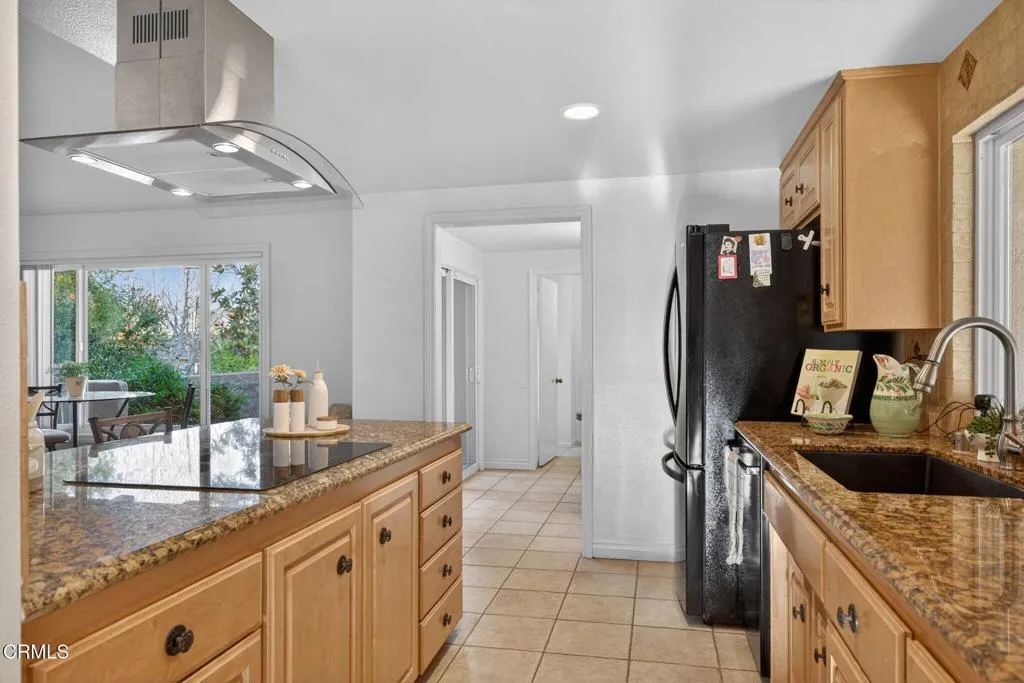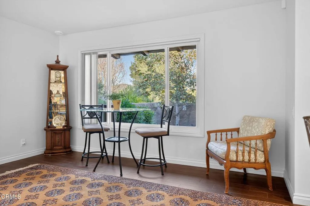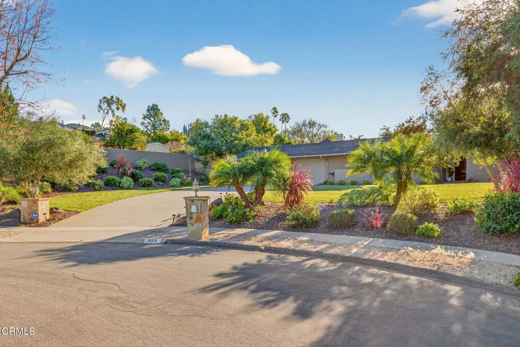 First time on the market, this rare Las Posas Estates California Ranch is nestled on a quiet cul-de-sac and set on over an 1/2 acre lot. With views stretching toward the surrounding hills and mountains, this home truly embraces the beauty of its setting. This warm and welcoming home offers 3 bedrooms plus a spacious office (originally a 4th bedroom), 2 bathrooms, and 2,178 square feet of living space, with a comfortable, flowing layout designed for both everyday living and easy entertaining. Updated wood-look tile flooring flows throughout the main living areas, with carpet in the bedrooms, complemented by smooth ceilings that showcase the home’s light, airy feel. The kitchen is enhanced with granite counters, a breakfast bar and an adjacent eat-in nook that opens to a charming garden patio. The kitchen flows seamlessly into a cozy family room, creating an inviting gathering space. The spacious living and dining room features a gas fireplace and opens directly to a large covered patio and an expansive backyard, where indoor and outdoor living come together beautifully.The primary bedroom overlooks lush front landscaping, while offering two step-in closets. The en-suite bath includes an upgraded custom walk-in shower and a skylight that fills the space with natural light. Two secondary bedrooms look out to the backyard, while the hall bath offers dual sinks, a tub, and a skylight. The home office/den includes built-in shelving, easily accommodates two workspaces, and can be converted back to a private fourth bedroom if desired, offering flexibility to meet a variety of needs. The expansive private, park-like backyard is a true highlight, featuring multiple patio areas, fruit trees, raised garden beds, and a workshop with electricity. A back gate with stairs provides a convenient shortcut to Las Posas Country Club, while the elevated setting delivers views, dramatic skies, and incredible sunsets. Enjoy the backyard’s current beauty or create your own paradise, with room for a pool, ADU, and so much more. This is California living at its finest. Additional highlights of this extremely well maintained home include a spacious three-car garage, laundry room, and air conditioning. Thoughtfully designed and ideally located, this is a rare opportunity to enjoy space, privacy, and the relaxed charm of the Las Posas Estates.
