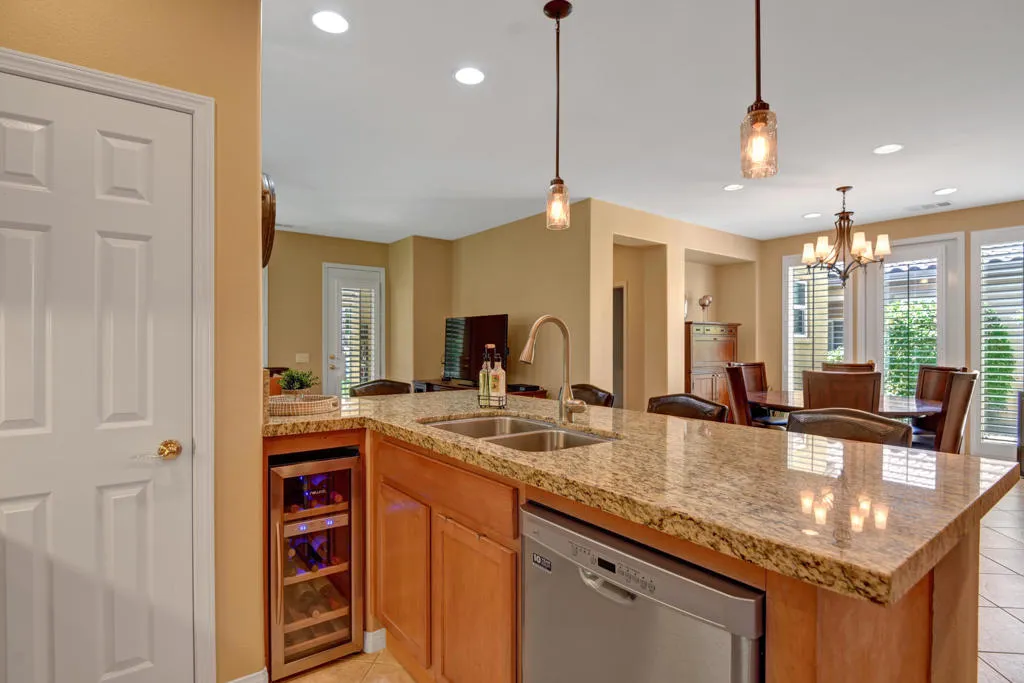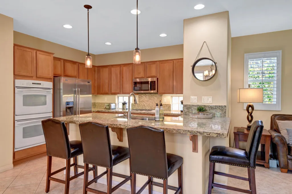 Ultimate location on the Water w/ panoramic Southwest Mountain views! Short term rentals permitted.Quaint open floor plan w/two Master suites each w/ their own ensuite and walk in closets. A niche area off the master bedroom w/ extra cabinetry and a 3rd bathroom for guests. The living room & master bedrm have direct rear patio access and views of the lake, mountains & flowing stream! A 2nd private patio off the dining area; both patios offer excellent outdoor living. Landscape features include a large lemon tree, colorful desert plant life & palm tree. Remodeled modern open kitchen now has an oversize granite island with wine fridge, newer dishwasher, glass block windows, double oven, double sink & pantry! Indoor dining or take the party outside to the enlarged patio with Alumna overhang a custom overhang heater for the cooler evenings and of course the commercial grade Mister system for those warm summer nights! Upgrades include paint, flooring, newer AC ceiling fans and shutters throughout. Indoor laundry & 2 car tandem garage. Fitness includes Bocce ball, pickle ball tennis & main pool & spa. IPCC offers 27 holes of golf, clubhouse and walking distance to Coachella music Festivals.Furnishings & Golf Cart can be made available outside of Escrow per Seller inventory list.