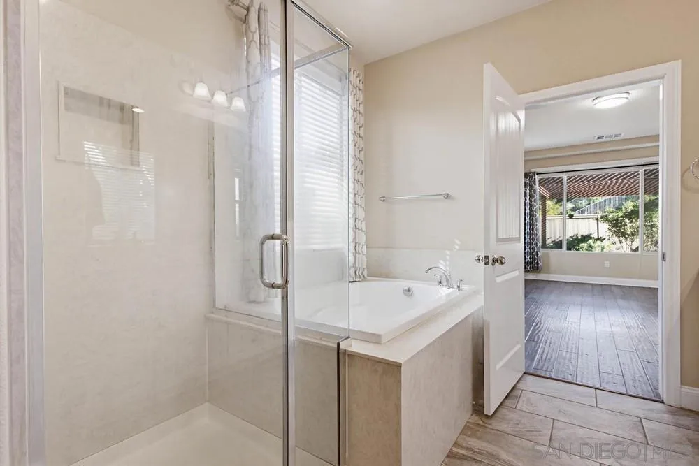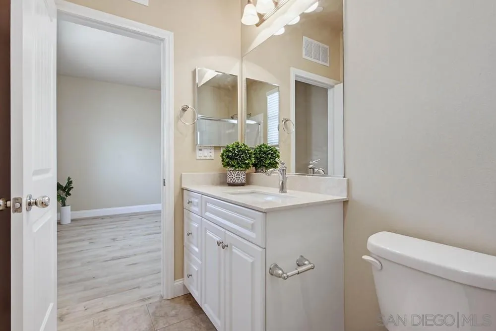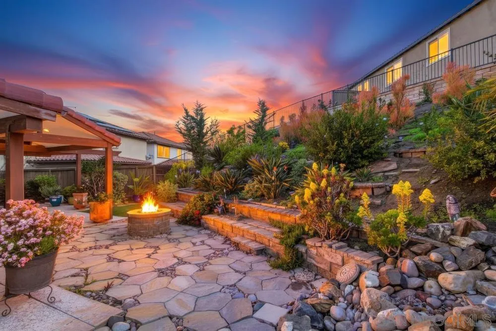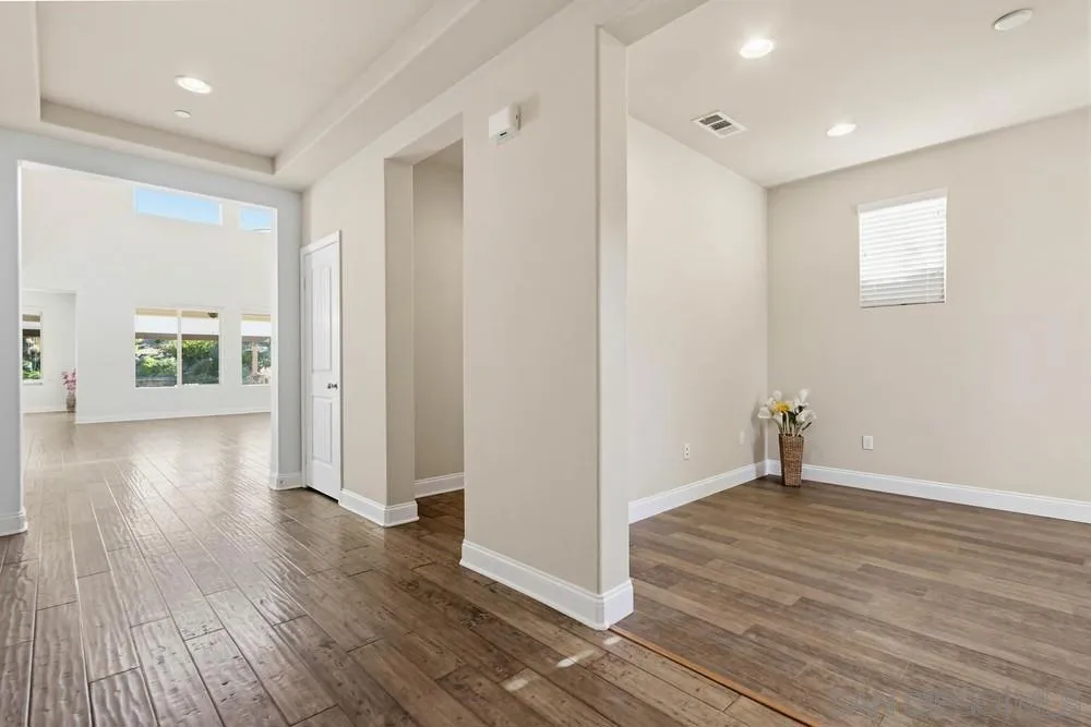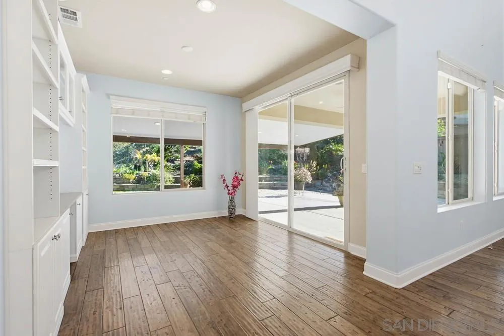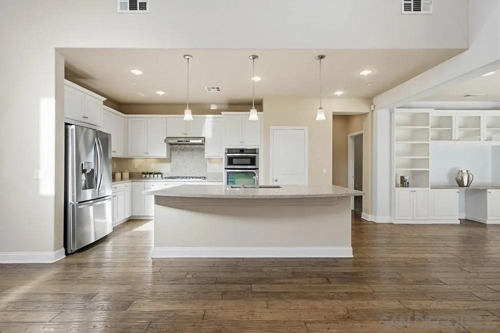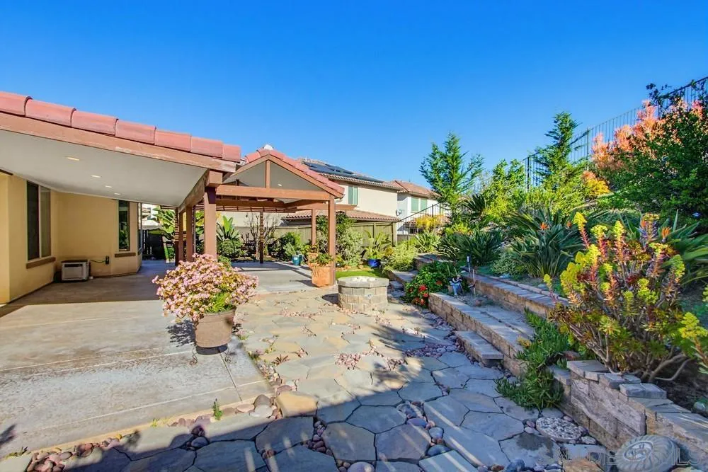 This gorgeous 5-bedroom home in the gated Laurel Pointe community features a highly desirable open-concept floor plan and paid-off solar panels that add both value and charm. The first-floor primary suite boasts a spa-like bath, a large walk-in closet with custom organizers, and custom finishes throughout. A den on the main level and four additional bedrooms upstairs, including a private suite, offer ample living space. Vaulted ceilings and abundant high windows fill the home with natural light, creating a warm and airy feel. Designed for entertaining, the gourmet kitchen opens to the great room and includes a center island, white cabinetry with European concealed hinges, neutral quartz countertops, stainless-steel oven, 5-burner gas cooktop, and built-in microwave. A stunning custom built-in cabinet in the dining room provides additional storage. Additional upgrades include beautifully updated wood flooring throughout the foyer and first floor, bullnose drywall corners, elegant baseboards, and an interior laundry room with countertop plus a convenient mudroom area. Upgrades abound inside and out, along with a 2-car garage and a stunning backyard. The exterior showcases thoughtfully designed landscaping with a unique grass checkerboard front yard, custom pavers, a covered patio, fruit trees, a fire pit, colorful succulents, and a tranquil waterfall, perfect for relaxing or hosting. Ideally located just eight miles from the beach and close to freeways, dining, shopping, schools, and Vista Sports Park.