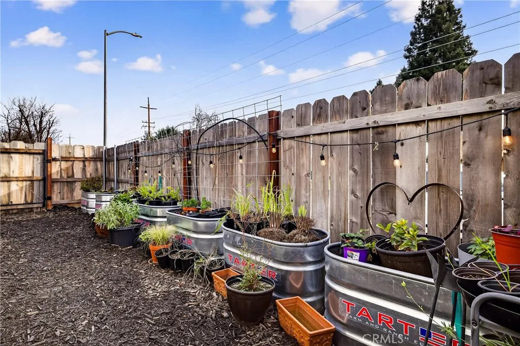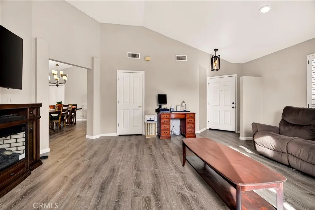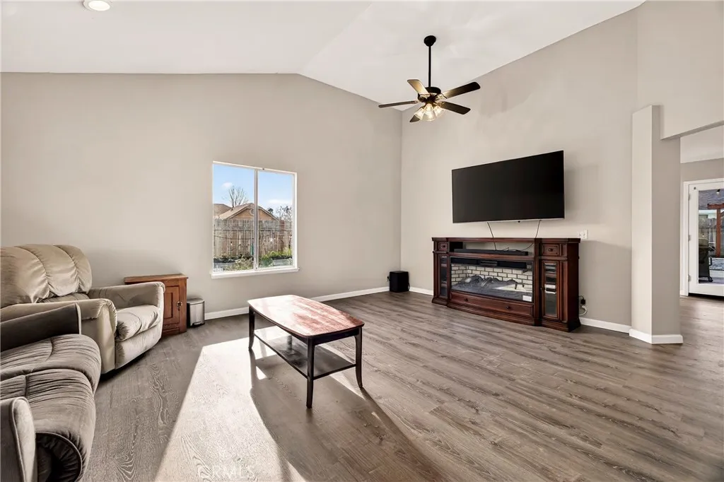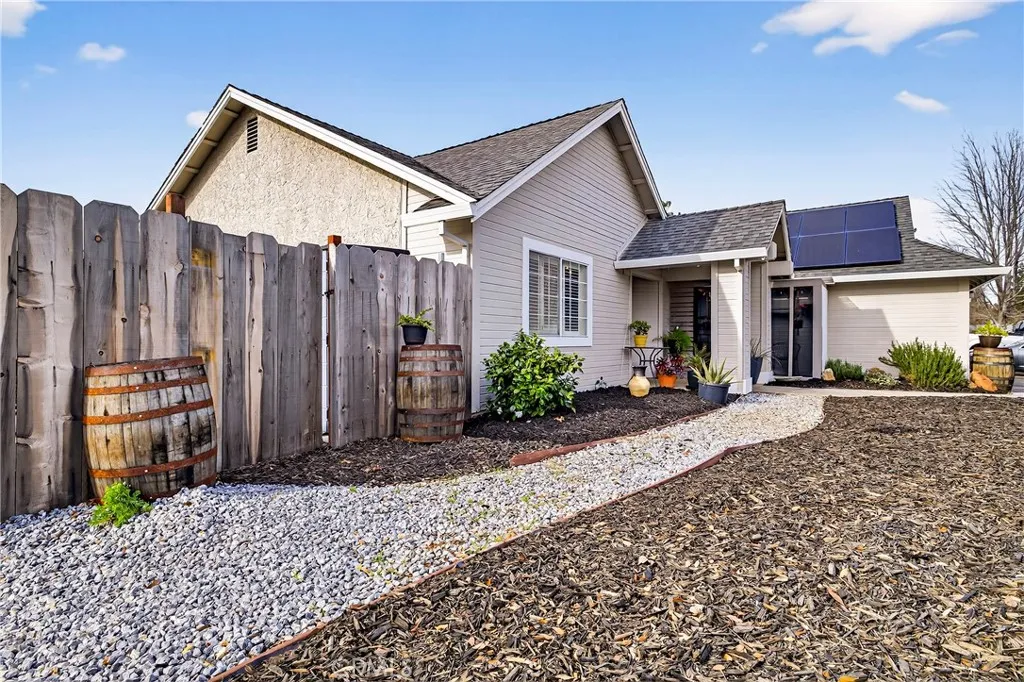 Inside, you’ll find comfort and modern luxury with a new high-end Lennox central heat and air system and 2025 luxury plank flooring throughout. The upgraded kitchen showcases Cambria Quartz countertops, a beautiful tiled backsplash, Samsung stainless steel appliances, freshly painted cabinets, a deep 10″ farm sink, and a cozy bay window breakfast nook. The 6-foot eating bar provides additional space for dining or entertaining. The spacious living room impresses with vaulted ceilings, recessed lighting, plantation shutters, and a new ceiling fan/light fixture. Off the kitchen, an additional living or dining area offers vaulted ceilings, a pantry closet, and glass door access to the backyard retreat. The primary suite features vaulted ceilings, a slider to the backyard, and mirrored closets. The primary bathroom includes dual sinks, a solid surface countertop, a new toilet, and a sleek step-in shower with glass doors. The guest bathroom has been upgraded with a luxurious 17″ deep soaking tub, Carrara marble tile walls, glass enclosure, and a new toilet. The backyard is an entertainer’s dream, featuring the resurfaced Pebble Tech pool, granite and marble ledger stone accent wall, and large 30-ft covered pergola with roll-down sunshades. A second covered patio adds 170 sq. ft. of shaded relaxation space. On the south side, a cross-fenced garden area with raised garden beds. Currently growing are a lemon, orange, lime, and tangerine trees which takes full advantage of the beautiful southern sun—perfect for homegrown enjoyment! This property truly blends energy efficiency, style, and resort-quality living—your personal paradise awaits!