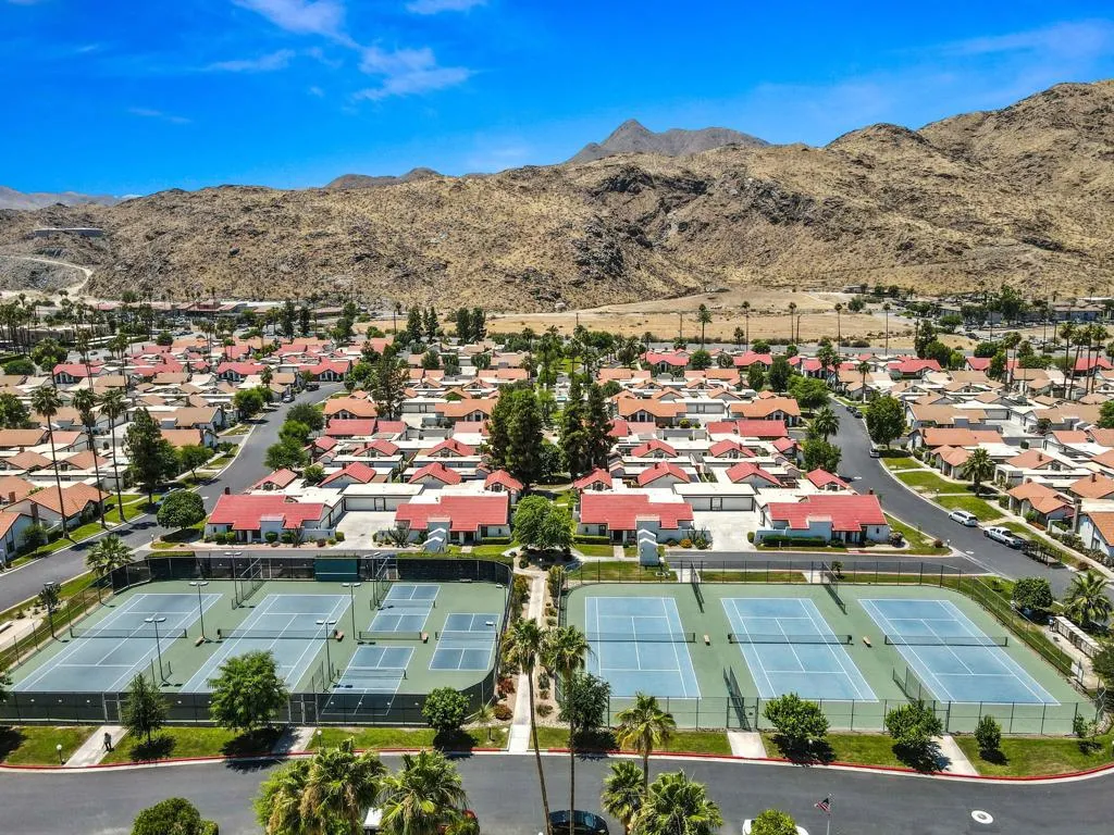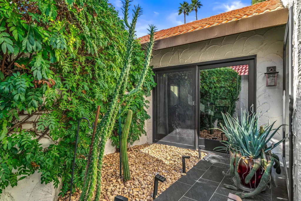Meticulously re-done and beautifully designed, this stunning 2-bedroom 2-bath condo is located in the highly sought-after Canyon Sands community of Palm Springs. Thoughtfully updated throughout, the home features stylish vinyl plank flooring and a light, airy layout that blends comfort with modern desert living. The spacious living room showcases vaulted ceilings with exposed beams, a cozy fireplace, and gorgeous oak-framed, unobstructed picture windows that flood the space with natural light. The chef’s kitchen is both functional and charming, offering butcher block countertops, a classic farmhouse sink, and ample workspace, perfect for everyday living or entertaining. The primary suite is a serene retreat with vaulted ceilings, direct access to a peaceful private courtyard patio, a large walk-in closet, and a beautifully appointed en-suite bath featuring a large walk-in shower. A second bedroom and bath provide flexibility for guests or a home office. Enjoy outdoor comfort on your beautifully landscaped private patio year-round with a retractable awning, ideal for hot summer days. Additional highlights include a private two-car garage with laundry and a mini-split to maintain a comfortable temperature year-around. Located in a quieter section of the community, this home features the added convenience of direct entry to your front door from Linden Way. Canyon Sands offers resort-style amenities, including 7 pools and spas, 2 saunas, 5 championship tennis courts, and 3 pickleball courts. HOA dues include water, cable and internet.Centrally located in the Coachella Valley, this exceptional home offers peaceful living with convenient access to everything Palm Springs has to offer.