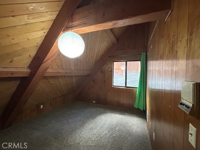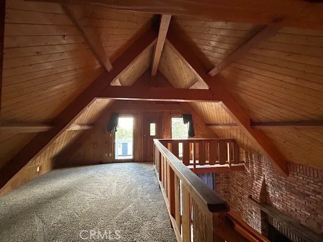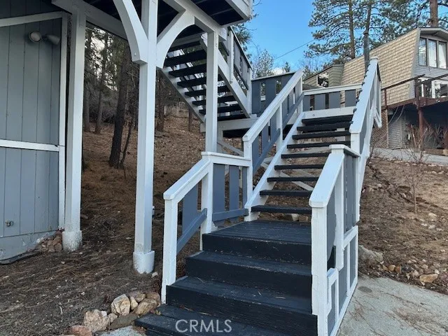 Rustic chalet with views of the mountains and Big Bear Lake. Watch the fireworks from the deck on July 4. Walk to the village for pizza and a movie. Open floor plan takes advantage of natural light and vaulted ceilings. Primary bedroom on first living level has deck access through sliding glass doors. Second and third bedrooms on upper level with loft. Loft has balcony area for lake views at sunrise. Loft makes a great office area with views of the mountains. Washer and dryer hookups in hall closet. Additional storage under the house.