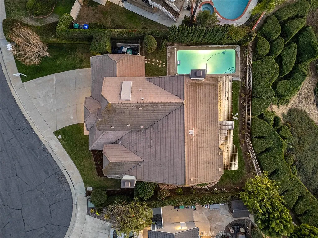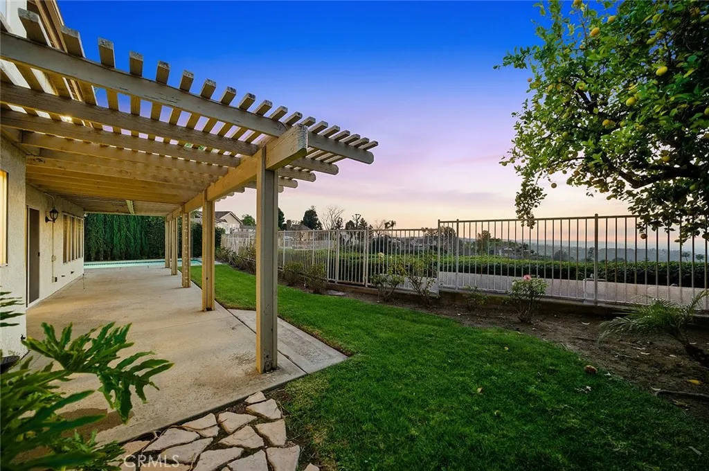 The private backyard features a resistance pool, ideal for exercise or relaxation while enjoying sunset views and surrounding hillsides. Mature landscaping, palm trees, and a wide driveway complement the outdoor setting.