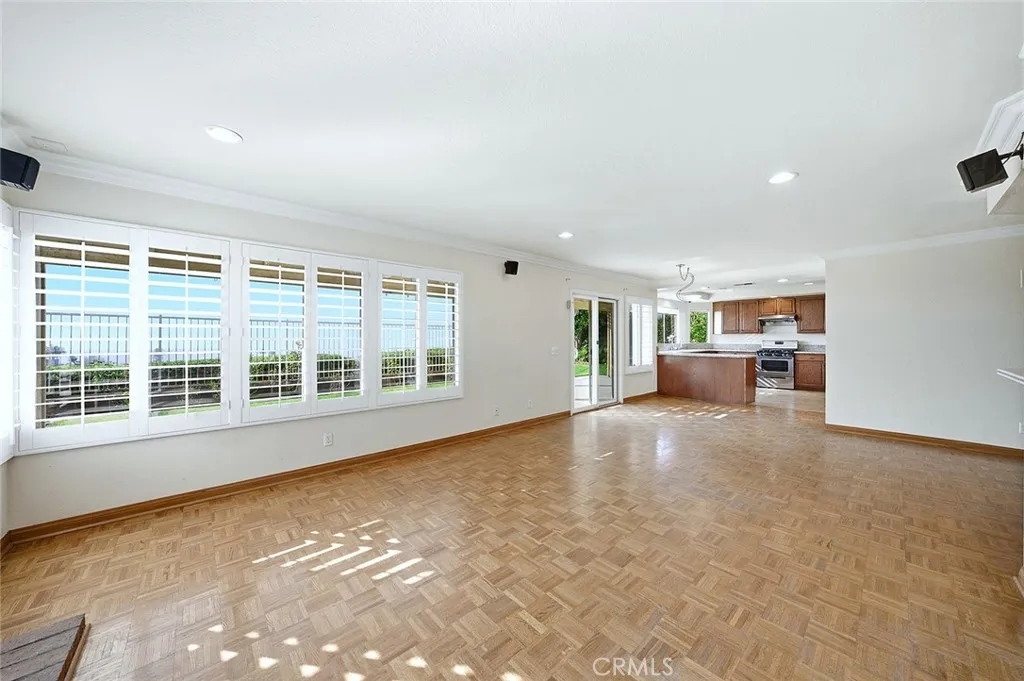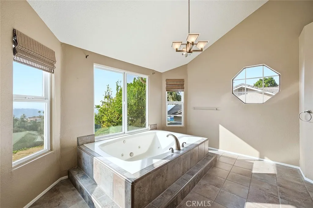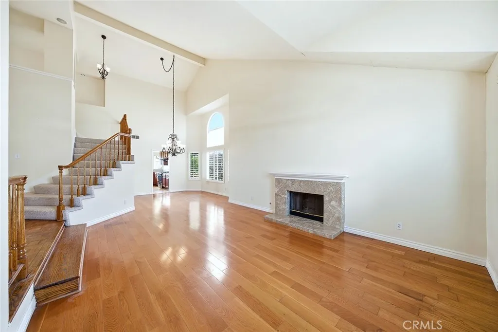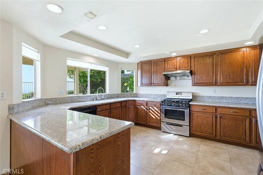 The light-filled interior features soaring ceilings and a flowing layout designed for everyday living and entertaining. The kitchen includes granite countertops, stainless steel appliances, and a walk-in pantry, opening to adjacent living and dining spaces with scenic hillside views. The living room and family room each feature a fireplace, adding warmth and definition to the main living spaces.