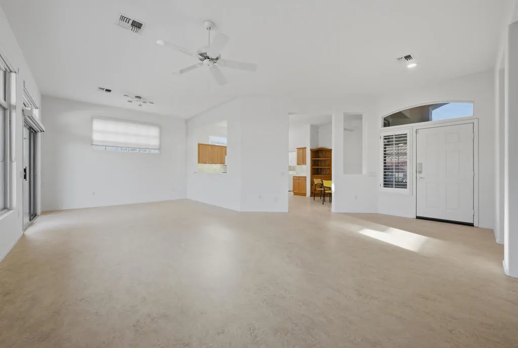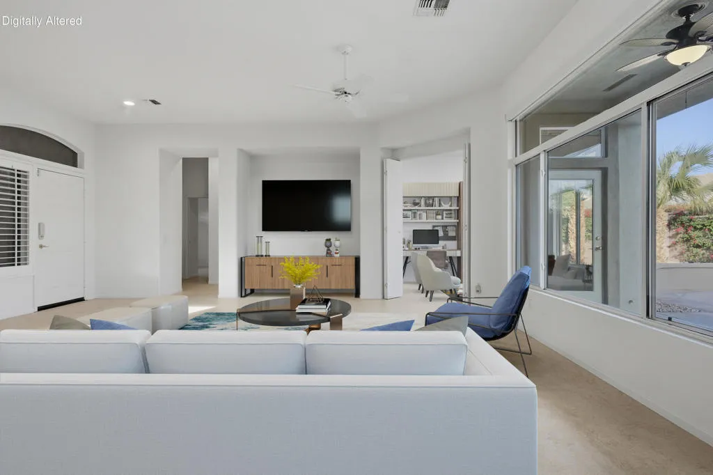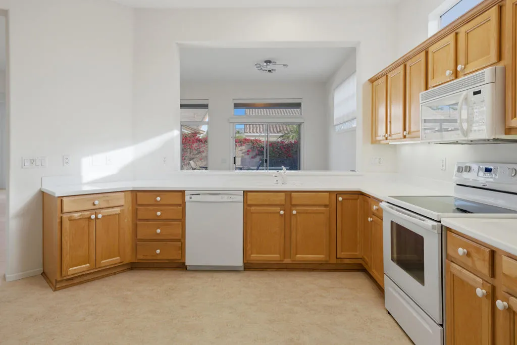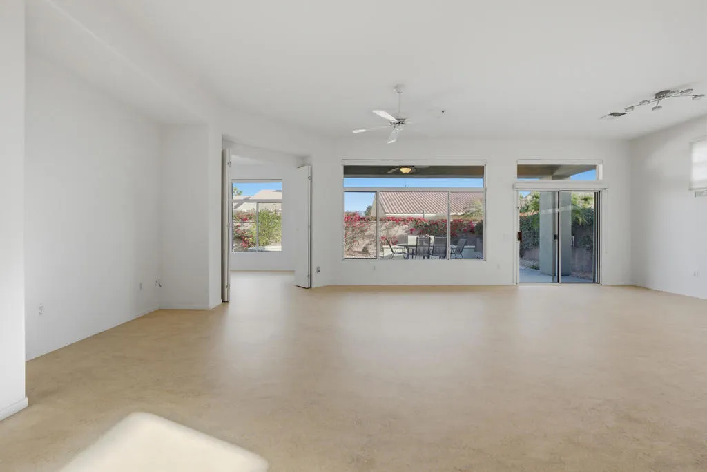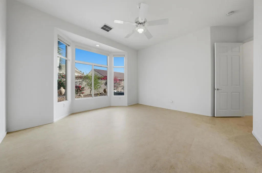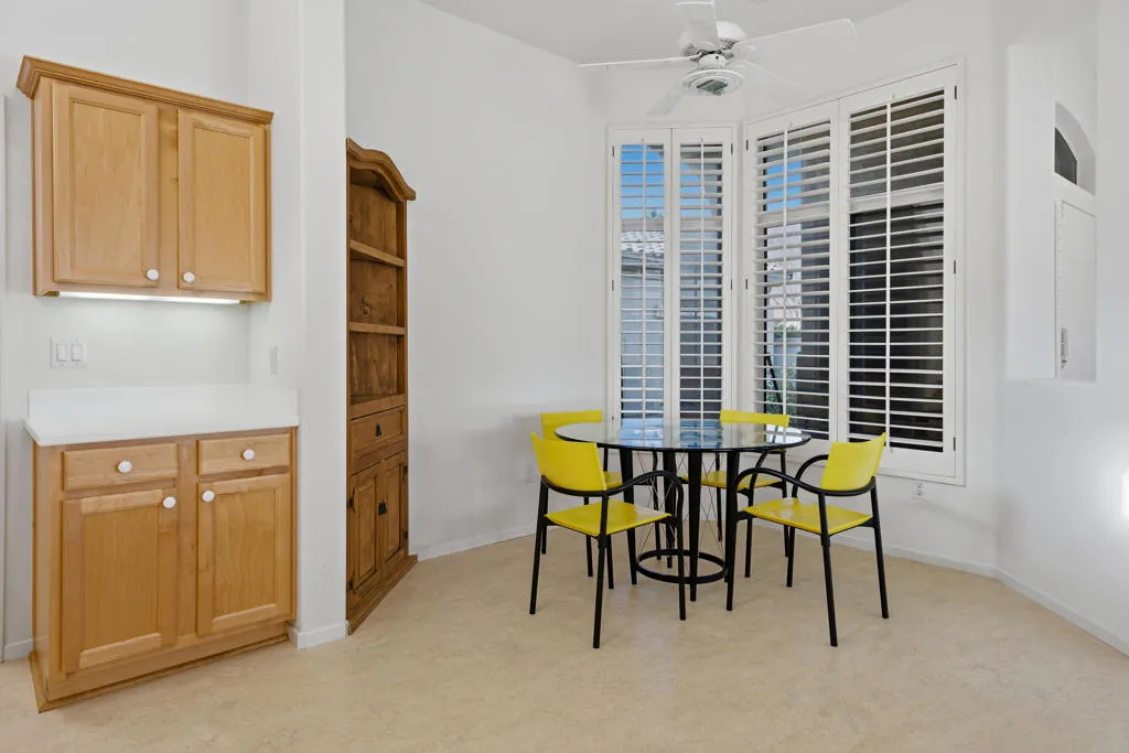 Sun City Palm Desert – Morocco with Casita. Ideally located in the heart of Sun City on a quiet street just a short distance from the Sunset View Clubhouse, this popular great room home offers comfort, privacy, and versatility. The north-facing rear yard features peekaboo mountain views, an extended patio, and lush desert landscaping with citrus–perfect for relaxing or entertaining. An updated exterior paint scheme and gated front courtyard with patio create inviting curb appeal. Inside, 10-foot ceilings and transom windows fill the home with natural light. Upgraded plank flooring and ceiling fans run throughout, and shutters cover all windows except the great room view windows. The spacious kitchen is appointed with Corian countertops, light maple cabinetry with pull-out shelves, recessed and under-cabinet lighting, and ample storage. Folding doors off the great room open to a flexible den or office. The primary suite features double-door entry, a bay window, an enlarged walk-in closet, and an en-suite bath with dual sinks and a stall shower with textured glass enclosure. The guest bath includes a tub/shower combination. French doors from the courtyard lead to the detached casita, providing a private guest bedroom with its own en-suite bath. Additional highlights include a laundry room with utility sink and built-in storage, a two-car garage with extensive built-ins, a golf cart parking nook, and man doors to both the courtyard and side yard. The main A/C was replaced in 2016.