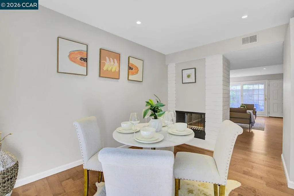 2-story townhome-style condo offers 1,224 sq. ft. of comfortable living space w 2 bedrooms & 1.5 bathrooms. Ideally located near the community pool, the home features engineered wood flooring throughout, a dual-sided fireplace connecting the dining & family rooms, & recessed lighting. The kitchen offers ample counter space & access to an oversized storage area under the staircase, while a convenient half bath completes the main level. From the living room, step out to your private flagstone patio, perfect for entertaining or quiet relaxation. Upstairs, the primary bedroom is filled w natural light & features a large closet. A walk-in storage closet in the hallway provides additional space. The home also incl one covered & one uncovered parking space. Enjoy the tranquil setting of this residence in the highly desirable town of Moraga—just steps from shopping, dining, parks and trails, & top-rated schools.