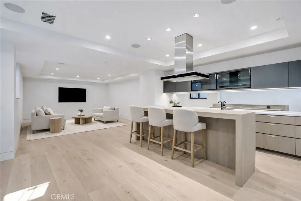 The top floor is a showpiece for entertaining and everyday enjoyment alike. Here, a sun-filled great room flows seamlessly to a covered ocean-view deck complete with fireplace and outdoor kitchen, creating an effortless indoor-outdoor experience. The chef’s kitchen anchors the space with striking finishes, premium appliances, and thoughtful design, complemented by a butler’s pantry and a dedicated Miele coffee station.