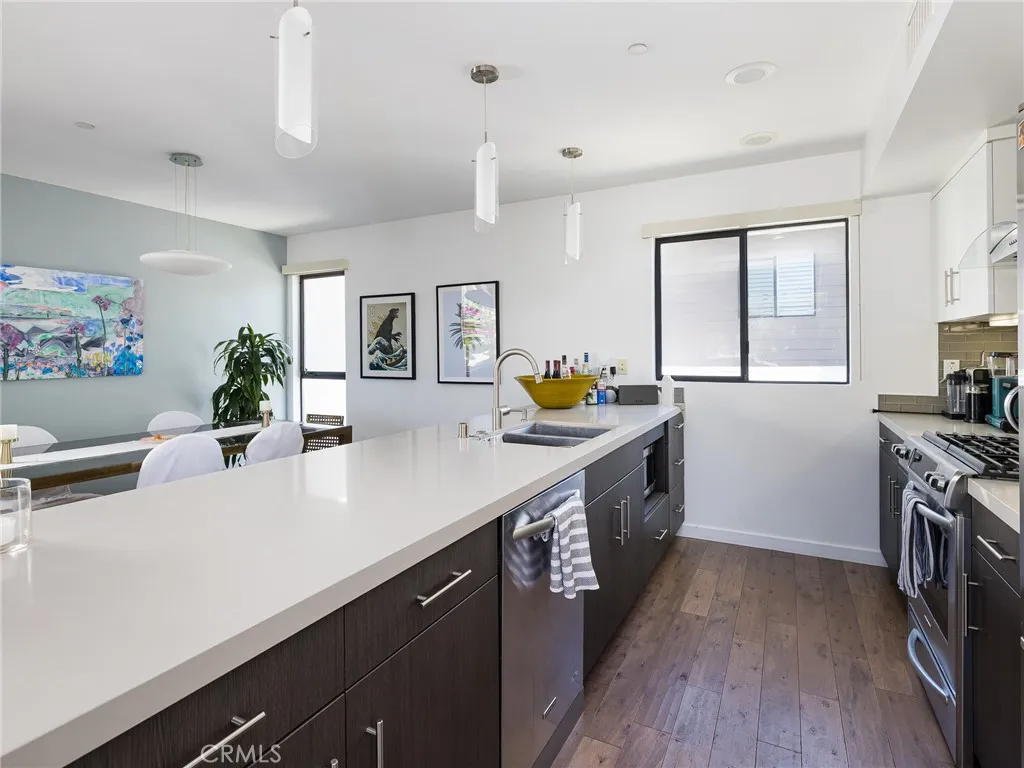 The top-level living area features hardwood flooring, a gas fireplace, and expansive sliding glass doors that open to a private balcony equipped with gas, water, and electric hookups, creating a seamless indoor-outdoor living experience. The kitchen is outfitted with custom cabinetry, Caesarstone countertops, a glass tile backsplash, and stainless steel appliances. Other highlights include a Remy Halo air purifier, water softener, tankless water heater, and central vacuum system.