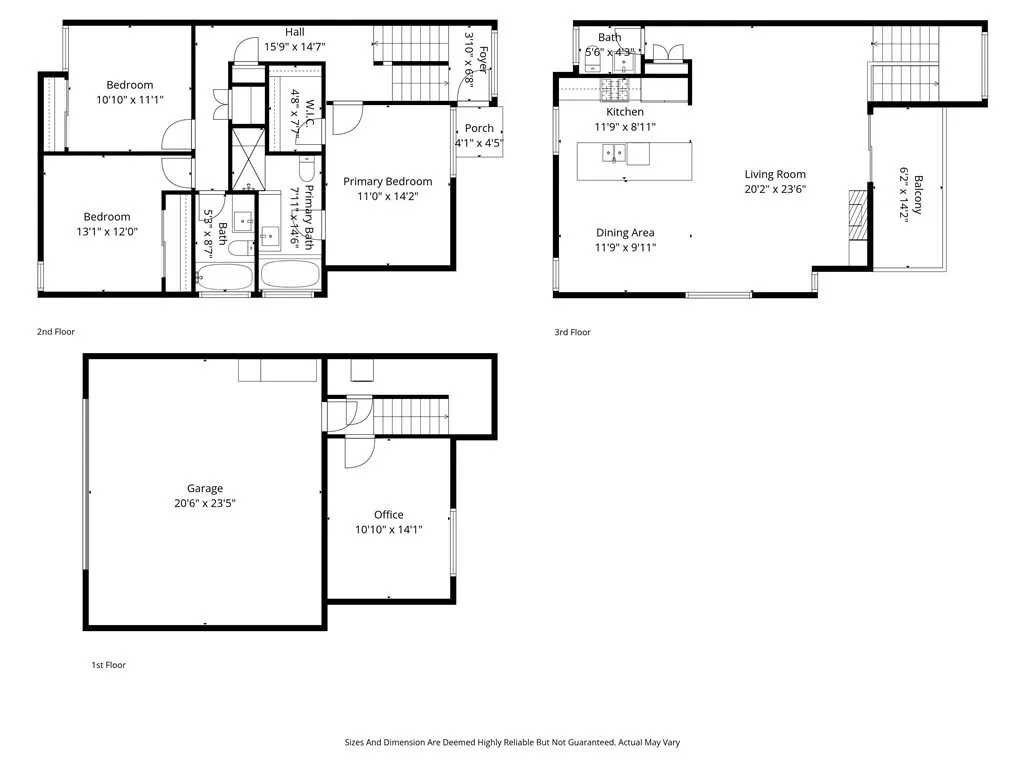 All three bedrooms are located on the middle level, including a spacious primary suite with a soaking tub and separate shower. The first floor offers a versatile bonus room, ideal for a home office, media room, or workout space. The living room, primary bedroom, and first-floor bonus room are all pre-wired for surround sound.