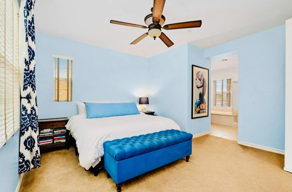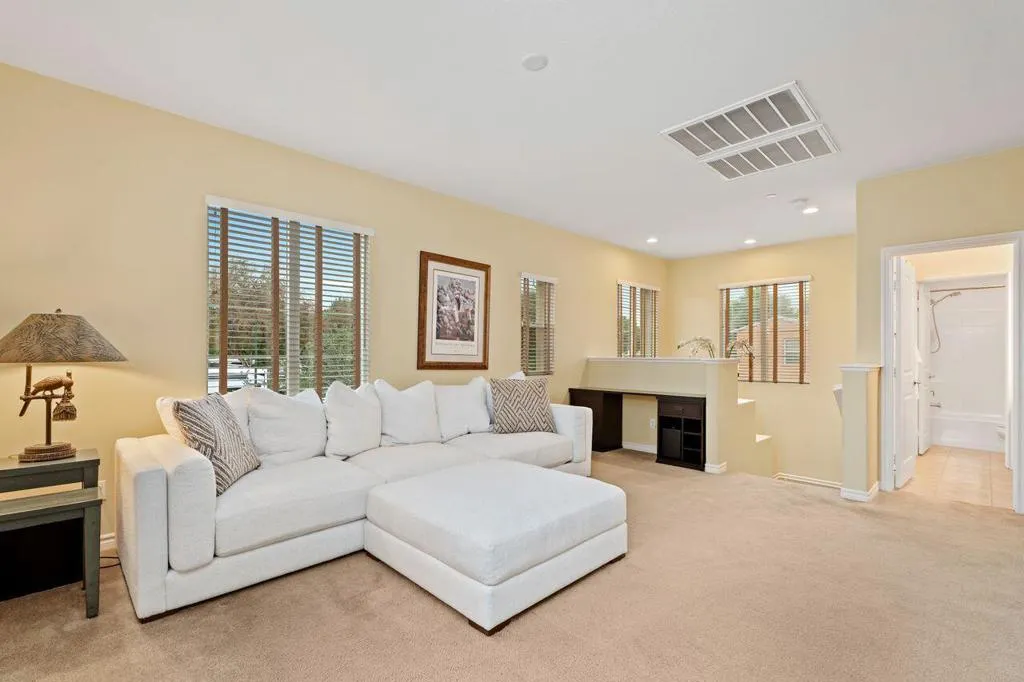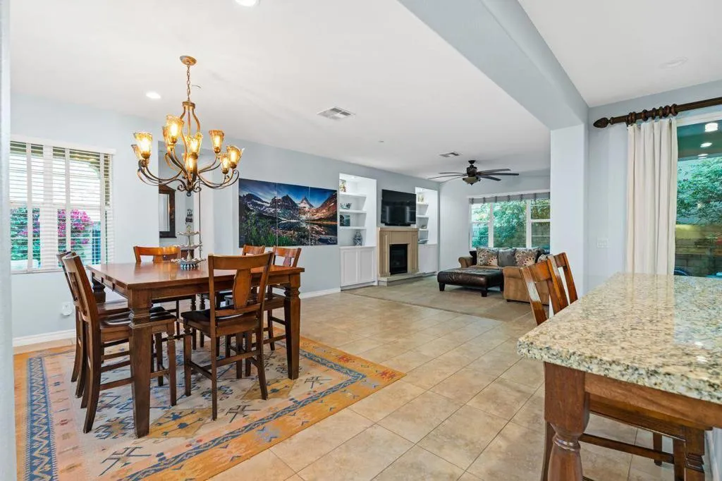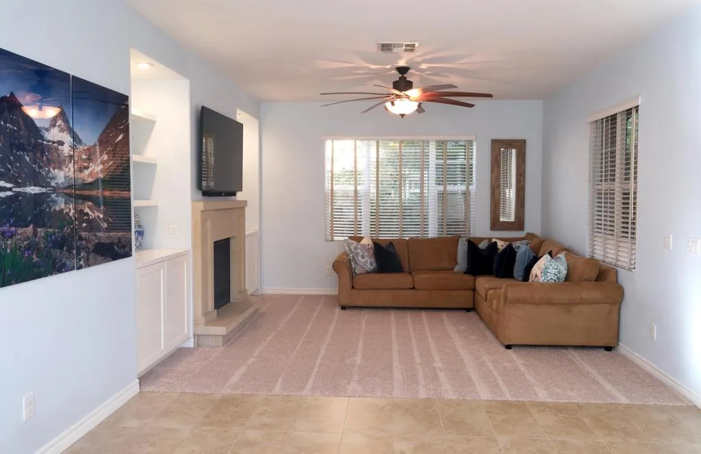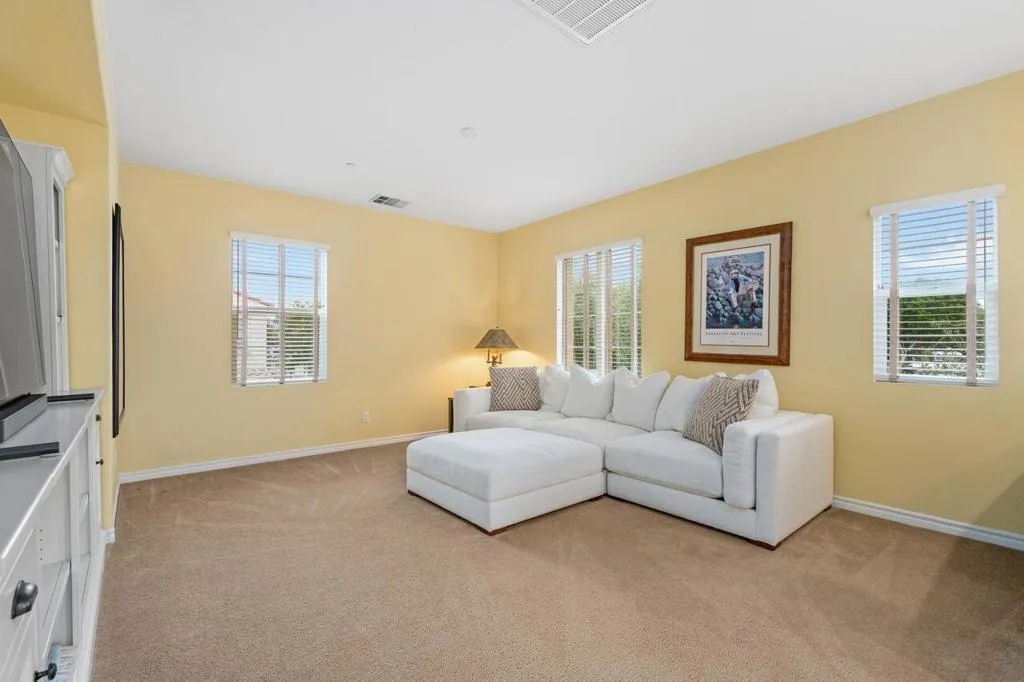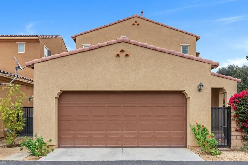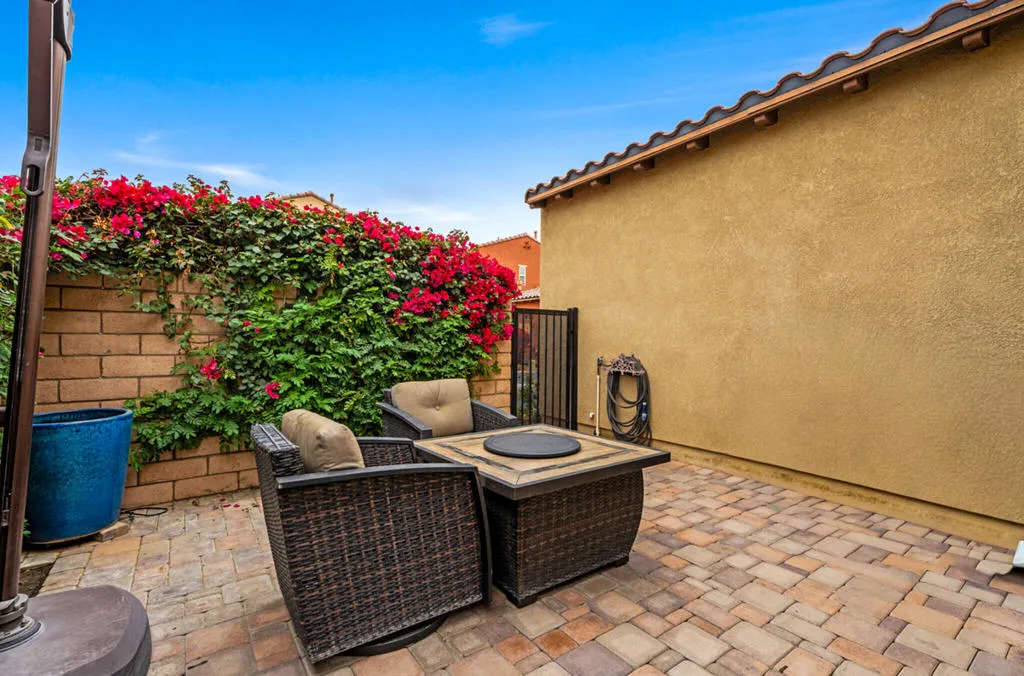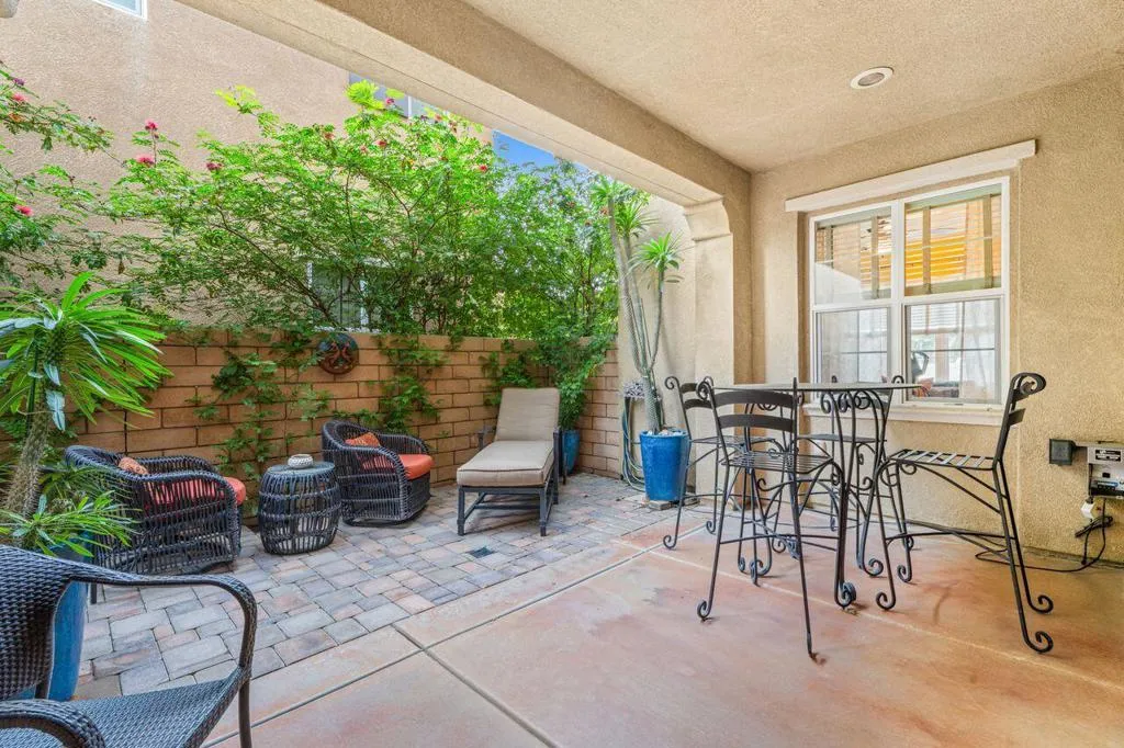 This rare corner lot residence in the gated Spanish Walk community delivers privacy and polish unmatched by other homes in the area. With its unique corner location, this property benefits from exceptional separation and natural screening rarely found at this price point. The home delivers 2,348 square feet with 3 bedrooms, 2.5 baths, a dedicated office/den and an open loft for added flexibility. The main living area is anchored by a hand carved limestone fireplace flanked by custom built-ins with roll out shelving, soft close cabinetry and integrated lighting providing both function and architectural presence. The kitchen was thoughtfully updated with a custom glass subway tile backsplash, refined fixtures and dimmable under cabinet lighting, with surrounding overhead LED lighting, a statement chandelier and designer ceiling fans adding cohesion to the space for a clean modern feel without sacrificing warmth. Custom window treatments elevate the overall finish. Smart Honeywell thermostats and Blink doorbell and camera system add efficiency and peace of mind. The outdoor living experience is where this home outshines the competition. Two private paver patios are fully enclosed with mature bougainvillea and greenery serviced by upgraded inground irrigation and lighting. The rear patio is shielded from neighboring sightlines offering a rare sense of retreat and privacy for outdoor dining, entertaining or quiet mornings. Spanish Walk residents enjoy three pools and spas, a fitness center, billiards room, a greenbelt and playgrounds coupled with low HOA dues and IID electric service. The home is in a rapidly expanding area with Palm Desert offering Eisenhower Health, El Paseo, Desert Willow, Acrisure Arena, the CSUSB Palm Desert campus expansion and city parks planned nearby. This strategically positioned home is a unique opportunity to capture design upgrades, real privacy and growth potential in the Coachella Valley.