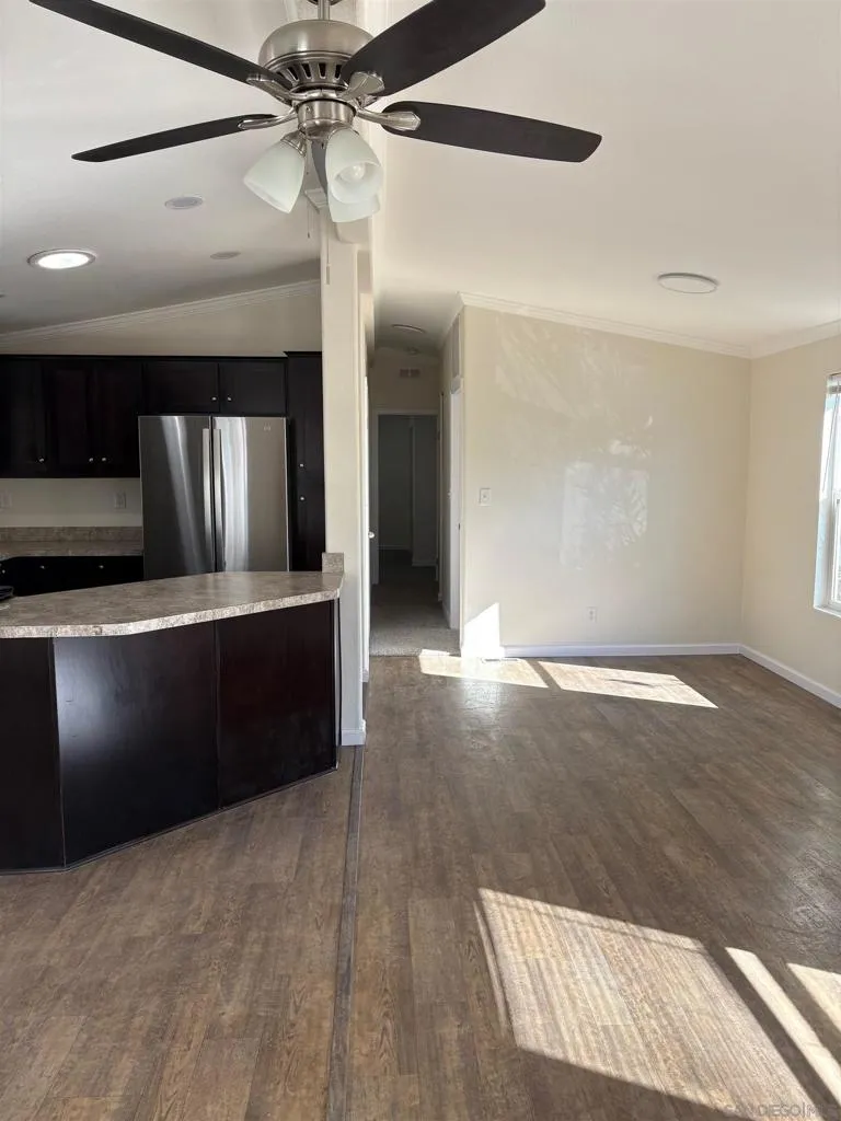 Very nicely appointed double wide Manufactured Home. This Golden Pacific was built in 2014, with many features including, vaulted ceilings, crown molding, newer stainless appliances, with a 5 burner stove. All is propane. Blinds throughout, dual pane windows, 3 ceiling fans with a neutral modern interior. This is a 55+ community, with a land lease of $735.00 per. month, water $65.00, trash $13.00, with a monthly pet fee of $25.00. SDG&E and Direct TV for services. Nice relaxing setting, boasting mountain views with part time on site management. Ask for Lynda, she’s eager to help. Lots of hiking, shopping and restaurants nearby. There is a clubhouse and pool with a bbq. This complex is clean and well maintained, on occasion management provides entertainment. This park does not disappoint. Priced to sell! Buyer to verify all before the close of escrow.